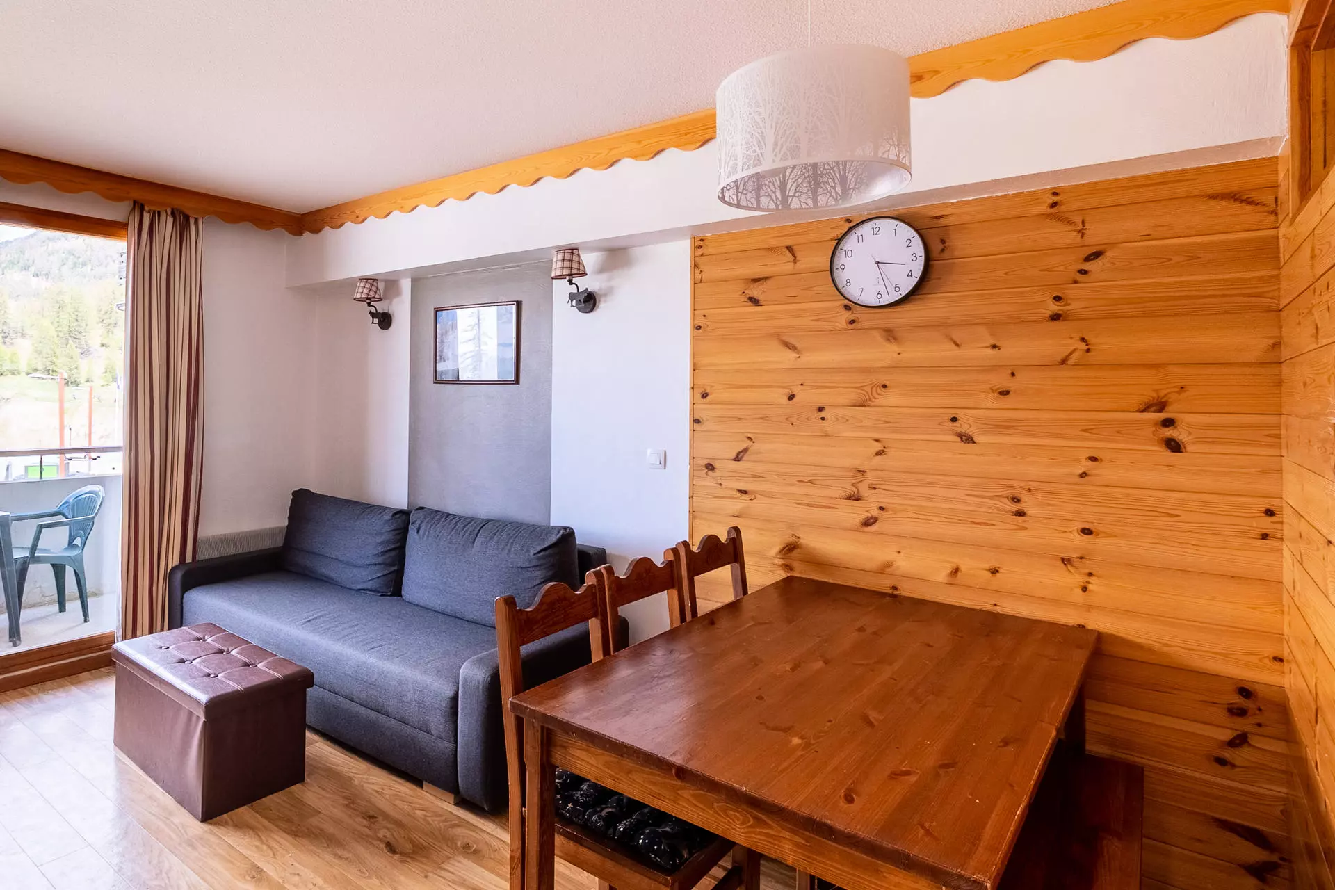 Cet appartement 2 pièces de 38 m² à l'ambiance rustique se trouve sur la place des Orres 1800, dans le bâtiment "Les Silènes" des Hauts de Préclaux et permet d'accueillir jusqu'à 6 personnes.