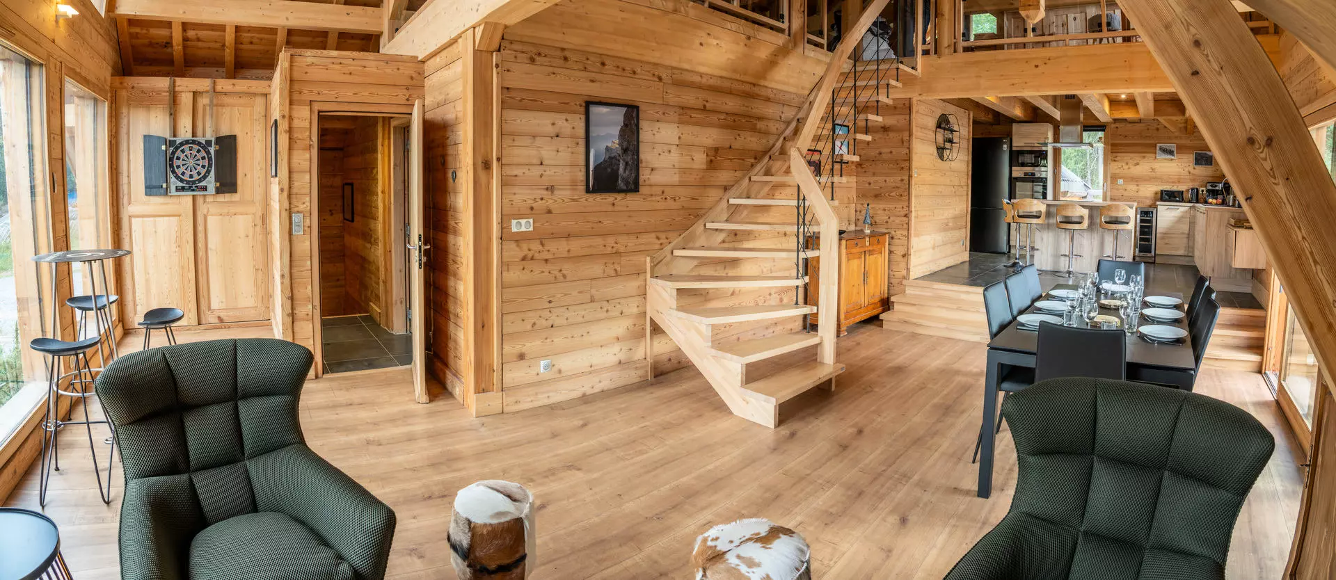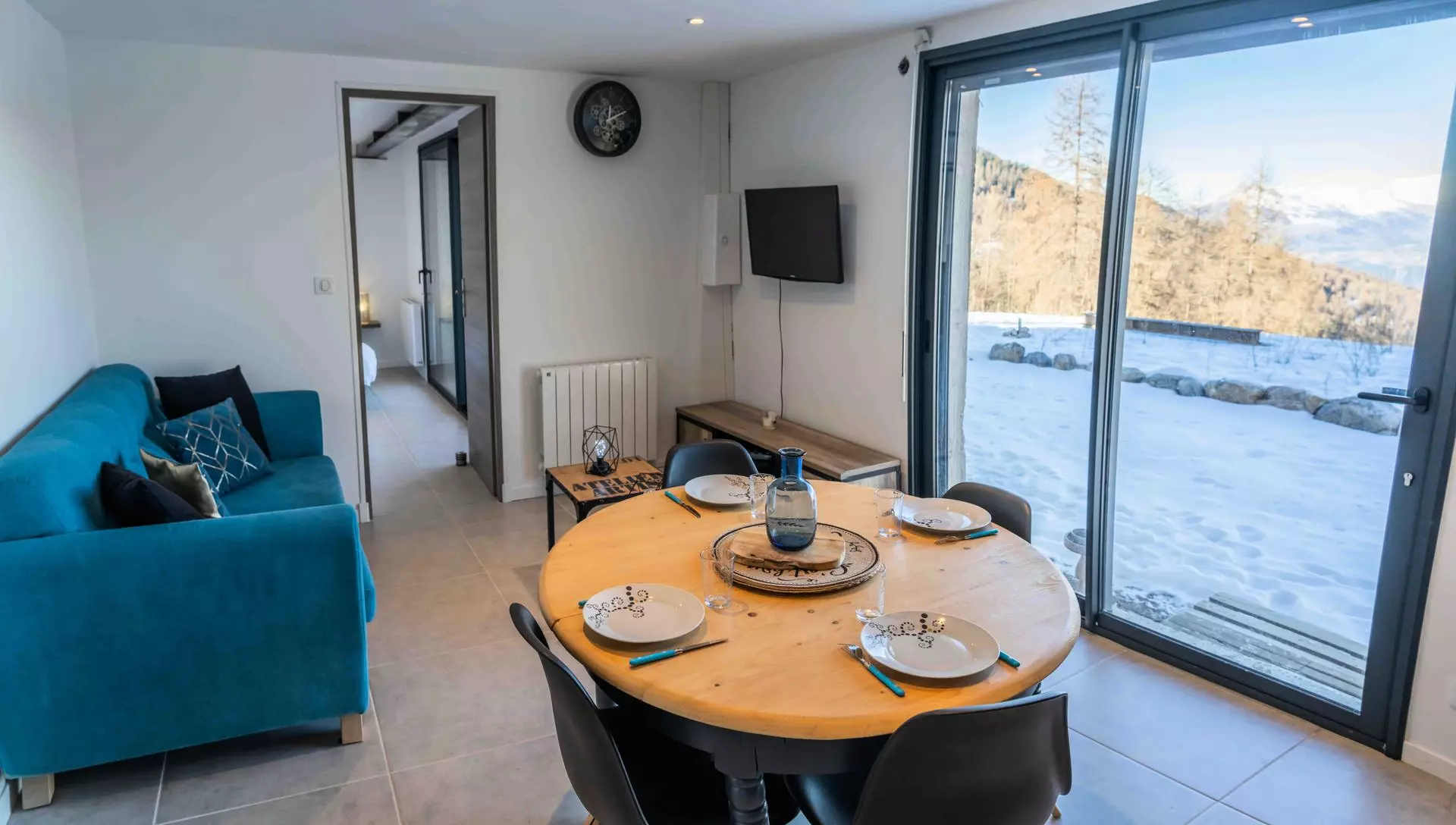 La pièce centrale, est le coeur de vie du chalet : ses nombreuses ouvertures vers l'extérieur laissent entrer le soleil des Alpes du Sud et donnent accès à la terrasse d'où vous profiterez d'une vue époustouflante sur toute la vallée de Serre-Ponçon.