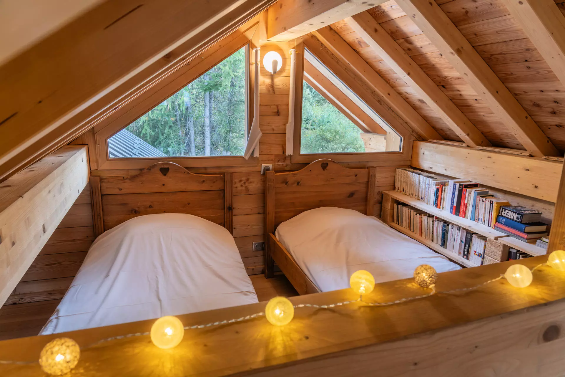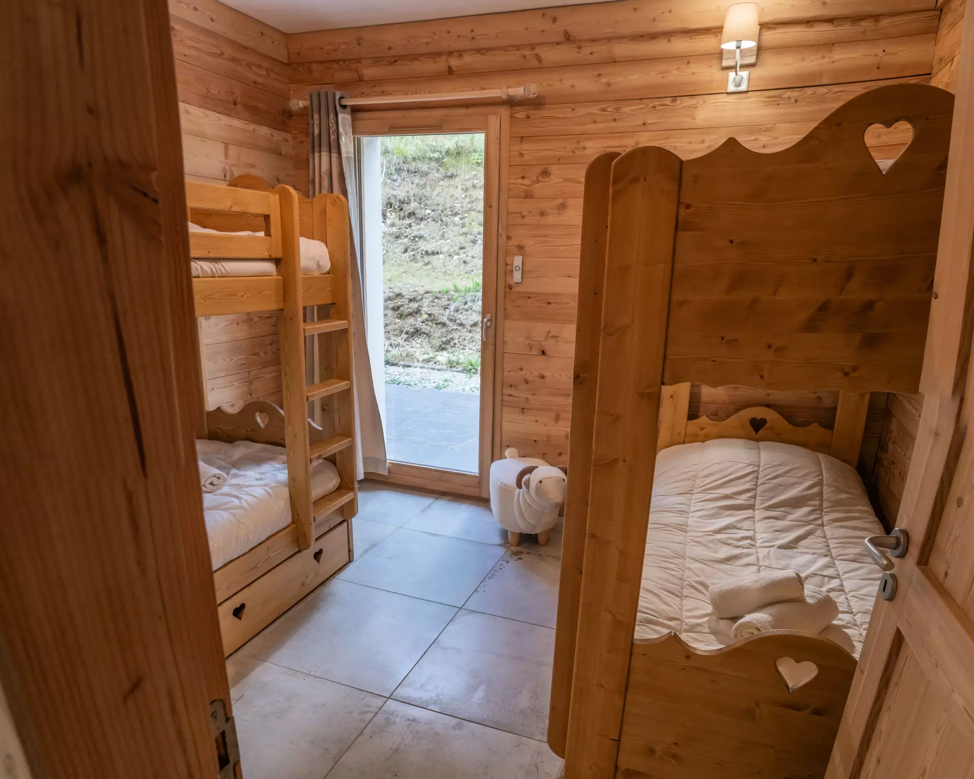 Au rez-de-chaussée : une chambre avec un lit double et une chambre avec 4 lits simples superposés