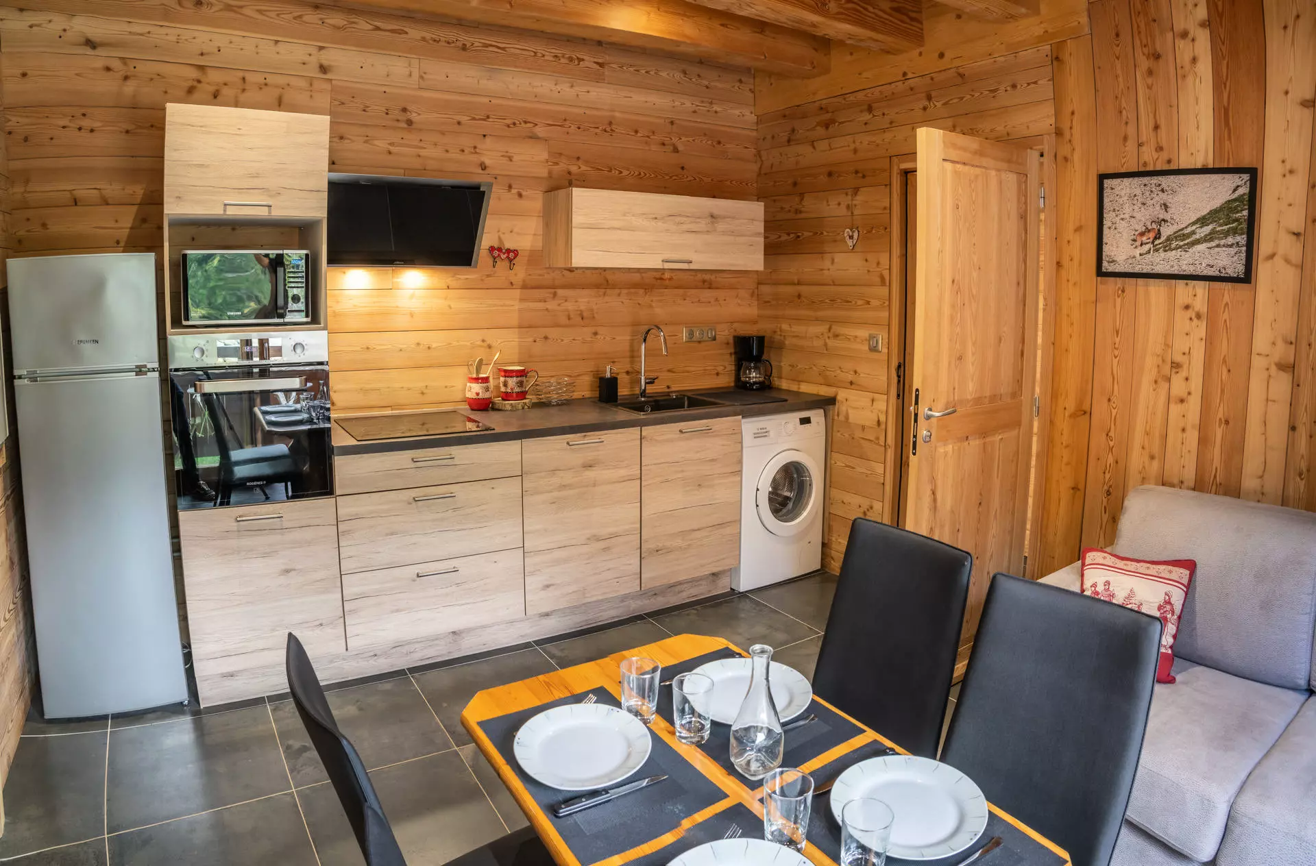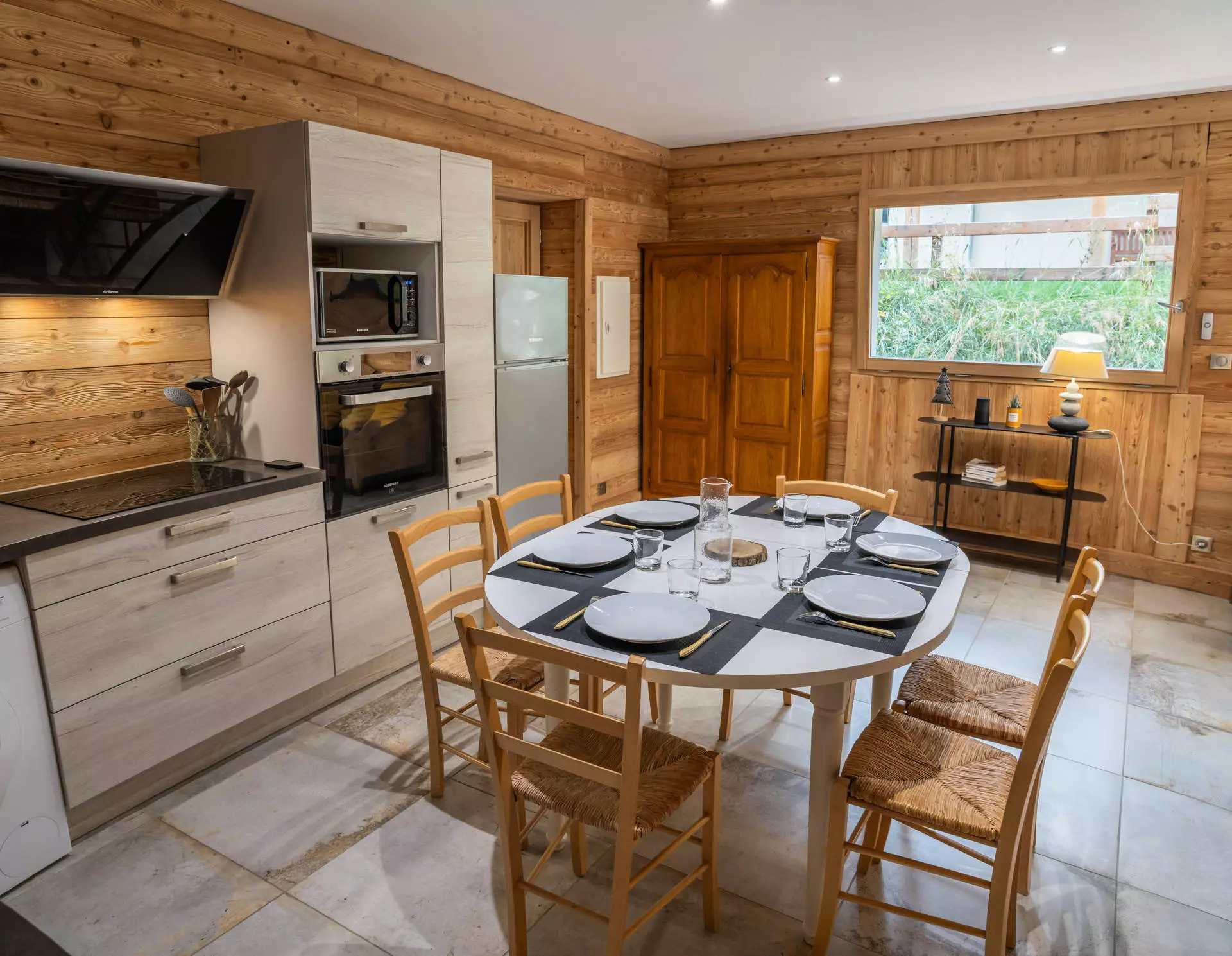 La salle à manger est conçue pour partager, avec ceux que vous aimez, de bons plats montagnards et peut accueillir à table jusqu'à 16 convives et plus. La cuisine ouverte et contemporaine, est parfaitement équipée : lave-vaisselle, four, cafetières à filtre et à dosette, micro-ondes, bouilloire, grille-pain, lave-linge et sèche-linge, appareil à raclette...