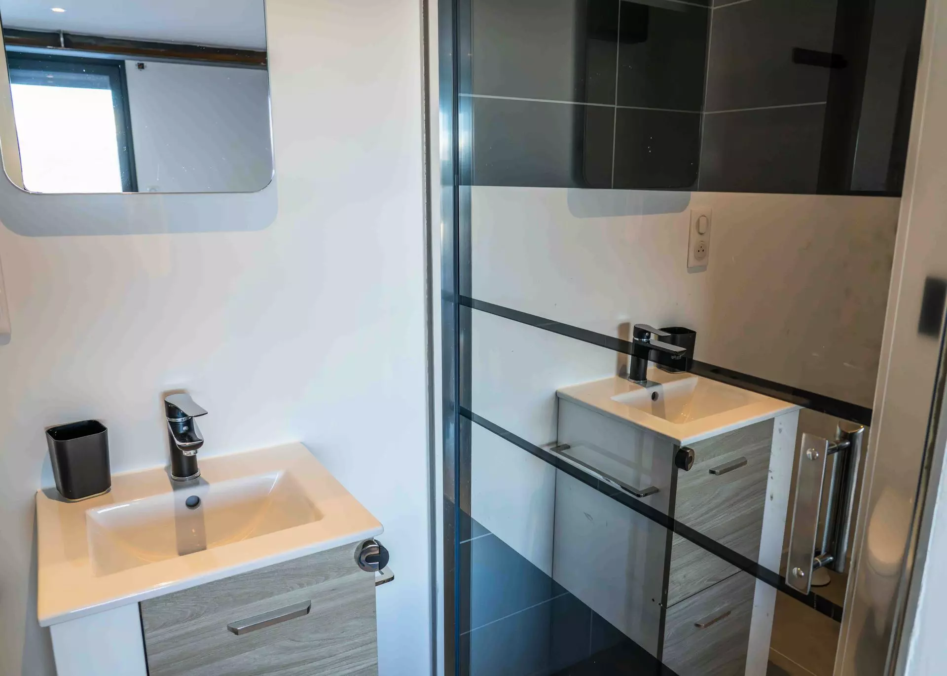 Côté couchages, vous disposerez d'une suite parentale permettant un accès direct vers l'extérieur par la baie vitrée, avec un grand lit double (160 x 200 cm) et un canapé-lit (140 x 190 cm) et sa salle d'eau privative avec WC. La chambre cabine se compose de 2 lits simples superposés (90 x 190 cm) et une seconde salle d'eau avec WC vient compléter le tout.