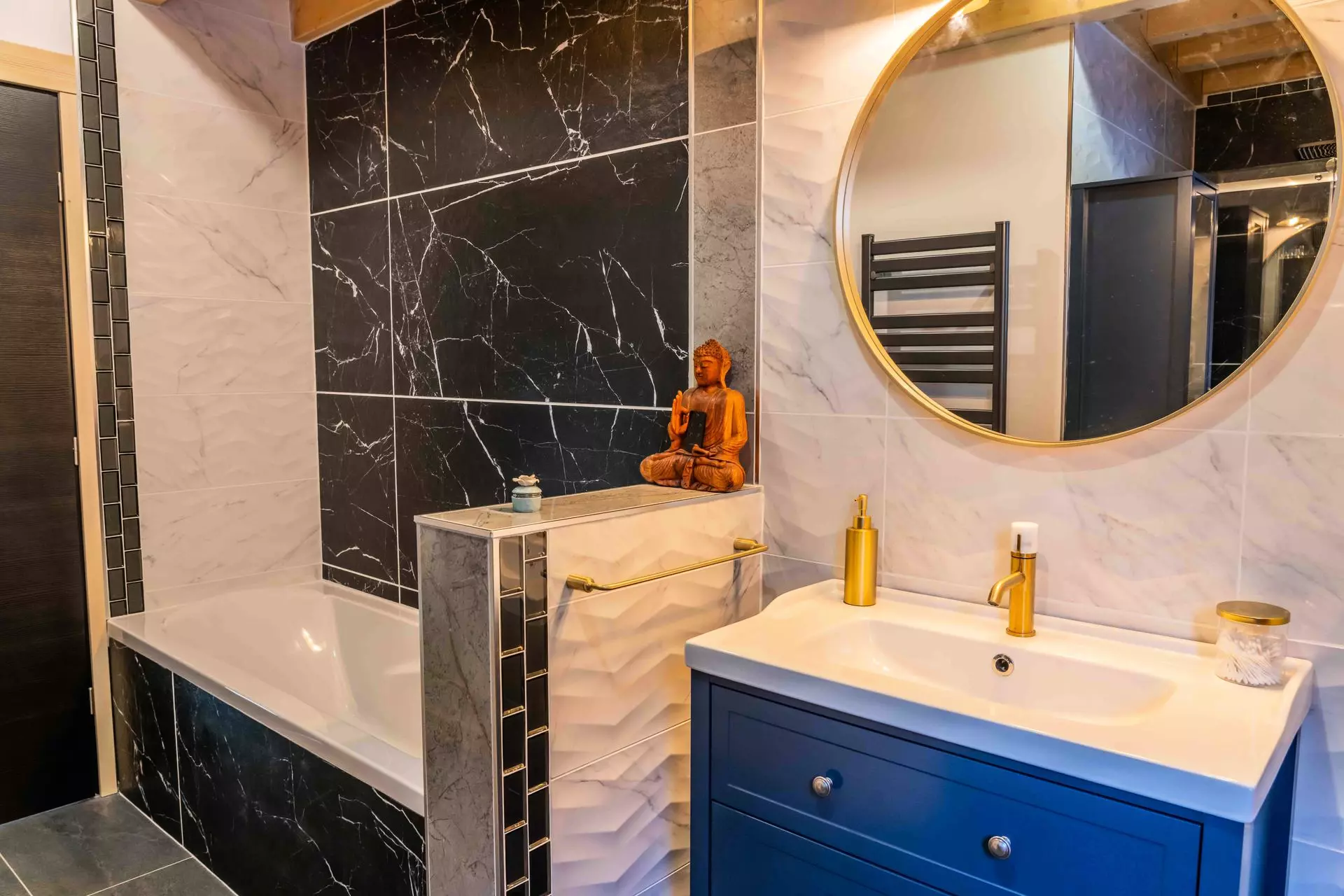 - Au rez-de-chaussée, la suite parentale est équipée d'un lit double (180 x 200 cm) et d'une sublime salle de bain avec WC, douche à l'italienne et baignoire.