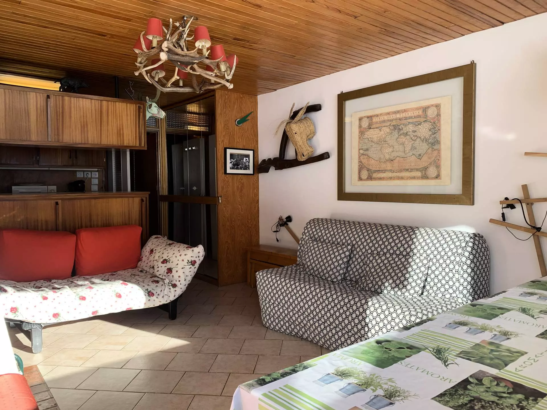 * Séjour : 1 convertible 2 places type BZ, 1 banquette 1 place, coin repas, TV en HD, carrelage au sol, accès balcon ;