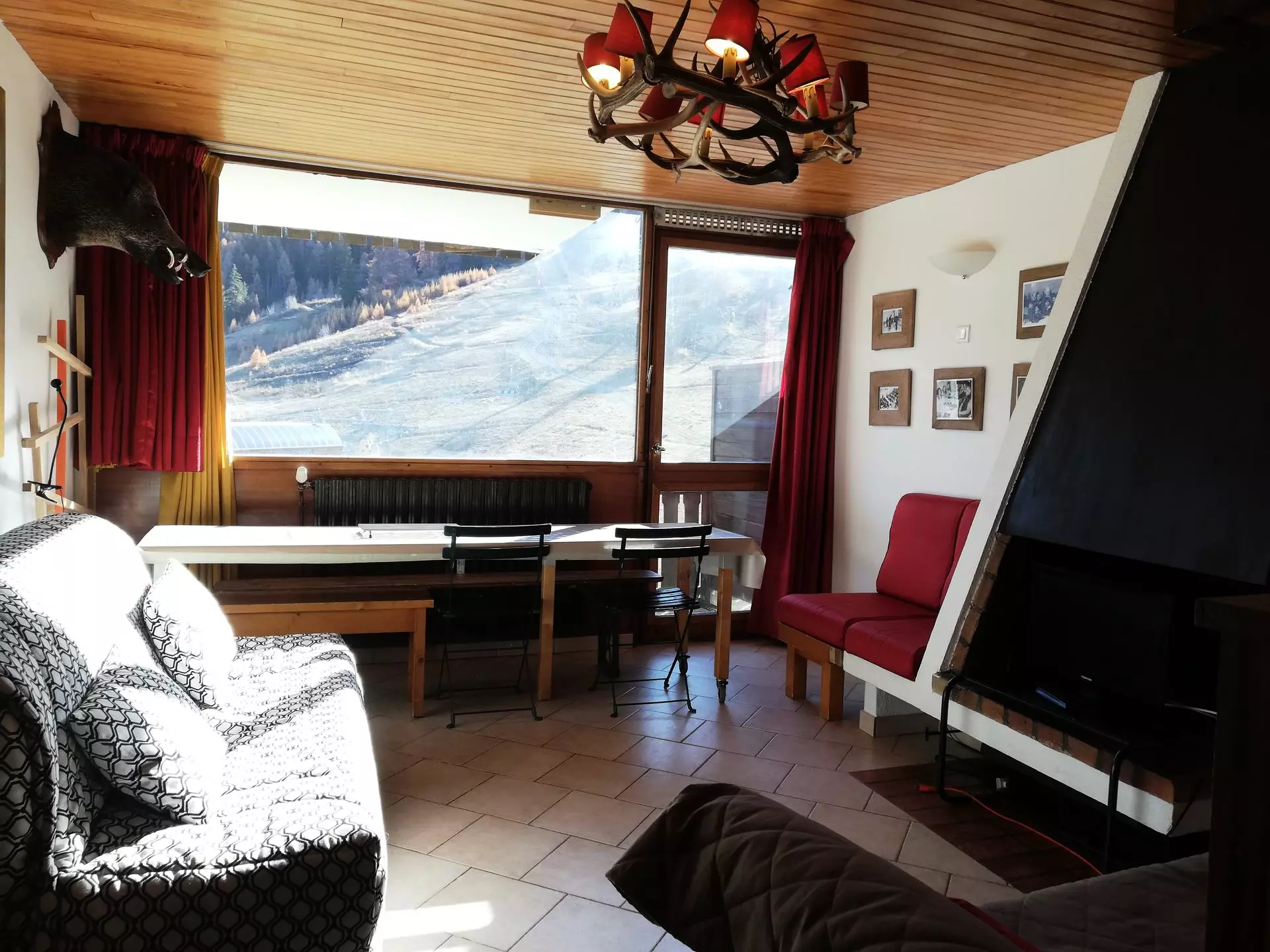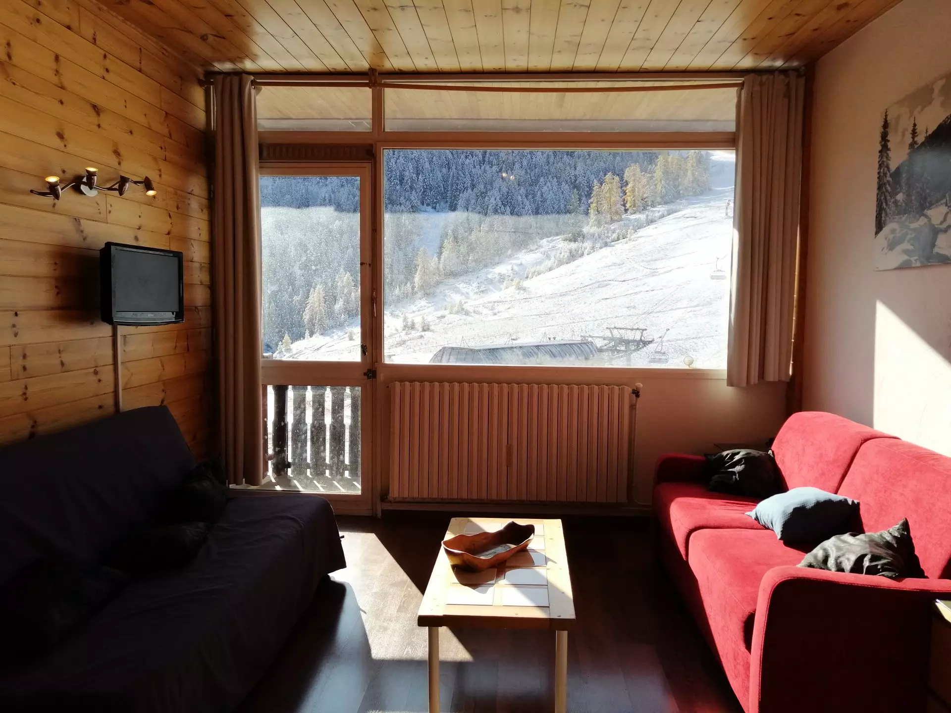 Situé au 1er étage sans ascenseur, escalier B, immeuble sur pistes. Exposé Sud avec balcon et vue sur les pistes et le Pain de Sucre.