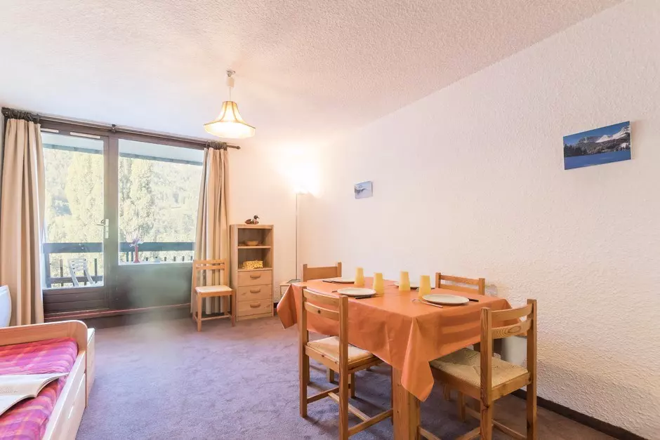 - d'un séjour avec tv et un clic-clac pour 2 personnes + petite terrasse orientée sud avec 2 chaises longues
