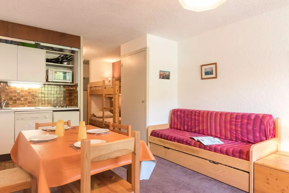 Studio 3 personnes équipé d'un séjour avec canapé lit 2 personnes et 2 lits superposés + 1 téléviseur
