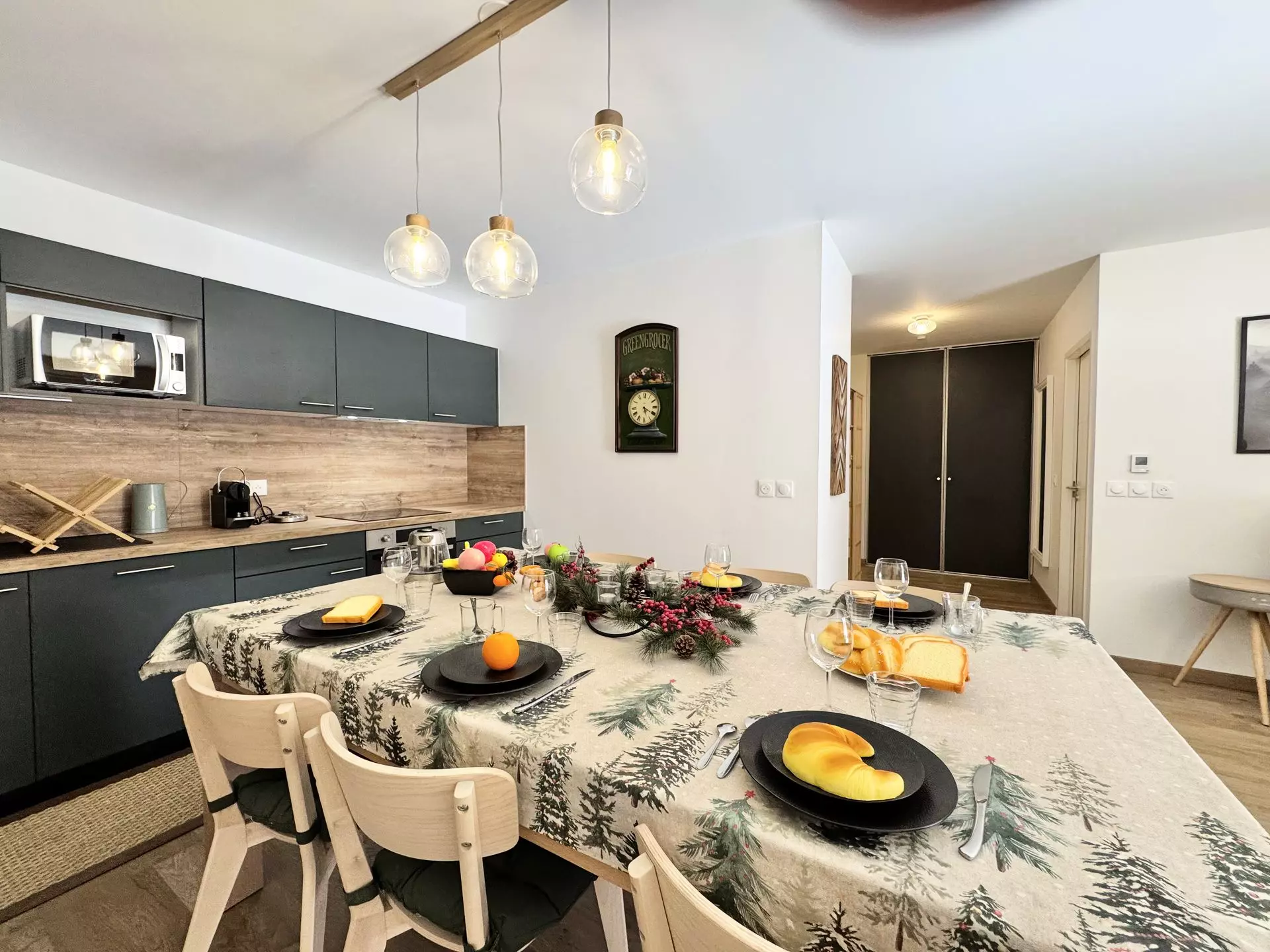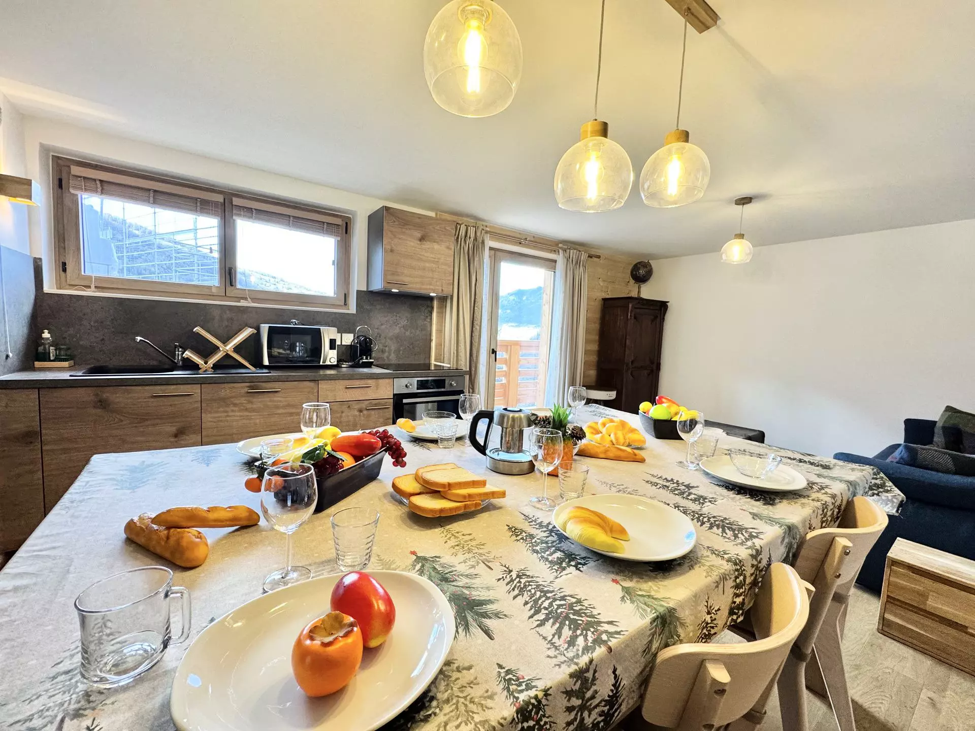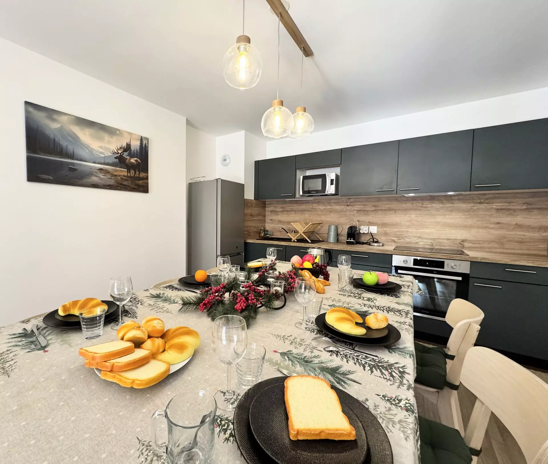 Le séjour, à la fois moderne et chaleureux, s'ouvre sur une terrasse attenante meublée avec table et chaises pour profiter de l'extérieur. Vous y trouverez également une grande télévision et une table à manger conviviale. La cuisine ouverte, parfaitement équipée, comprend un four, un micro-ondes, un réfrigérateur, un lave-vaisselle, ainsi que tous les ustensiles et la vaisselle nécessaires. Vous disposerez également d'appareils pratiques tels qu'un grille-pain, une bouilloire, une machine à café Dolce Gusto, un mixeur plongeant, ainsi qu'une machine à raclette avec fonction pierrade et un appareil à fondue pour des repas chaleureux en famille ou entre amis.