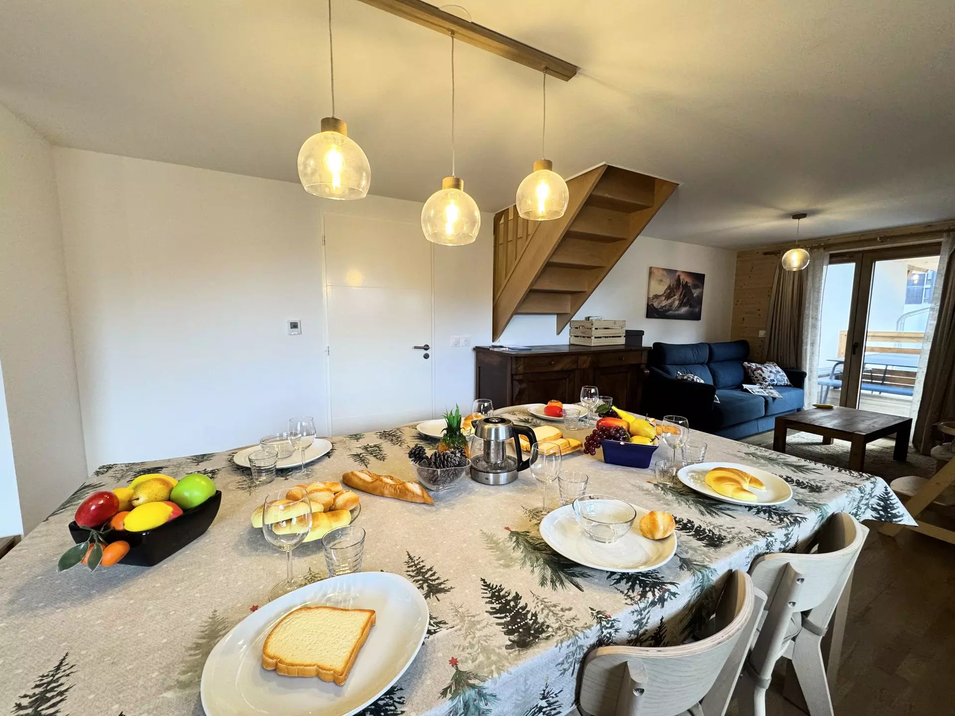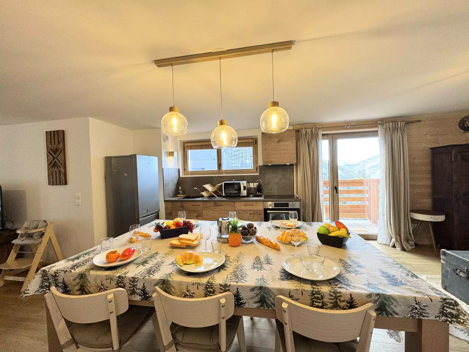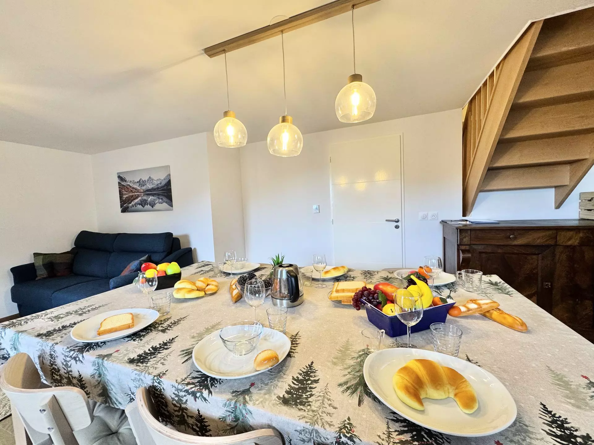 Le séjour, à la fois moderne et chaleureux, s'ouvre sur une terrasse attenante meublée avec table et chaises pour profiter de l'extérieur. Vous y trouverez également une grande télévision et une table à manger conviviale. La cuisine ouverte, parfaitement équipée, comprend un four, un micro-ondes, un réfrigérateur, un lave-vaisselle, ainsi que tous les ustensiles et la vaisselle nécessaires. Vous disposerez également d'appareils pratiques tels qu'un grille-pain, une bouilloire, une machine à café Dolce Gusto, un mixeur plongeant, ainsi qu'une machine à raclette avec fonction pierrade et un appareil à fondue pour des repas chaleureux en famille ou entre amis.