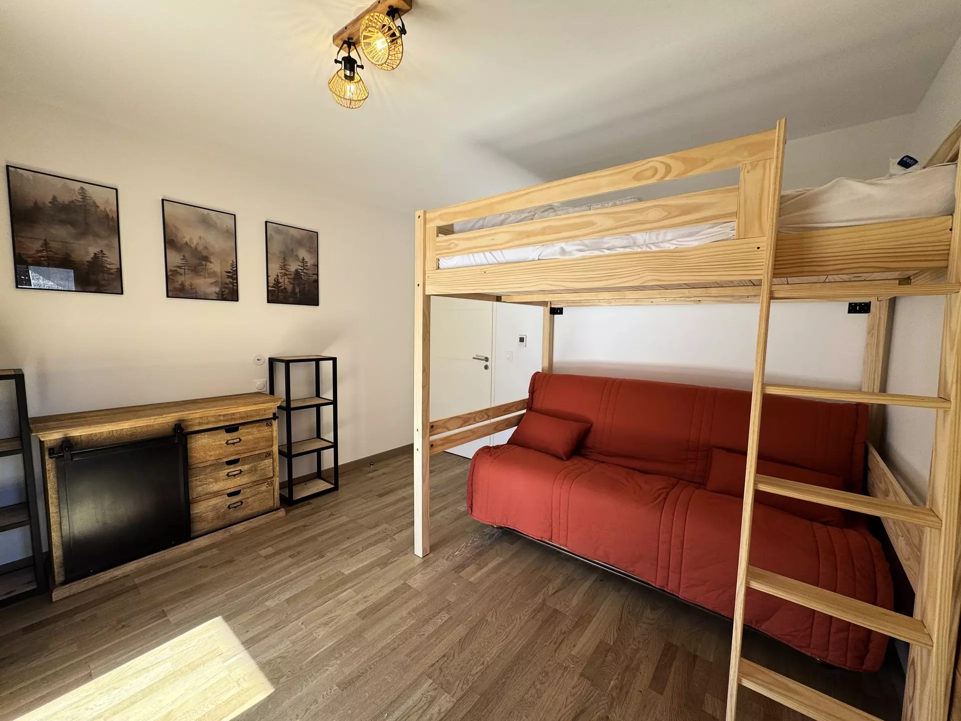Une première chambre avec un lit double en hauteur et un canapé-lit double.