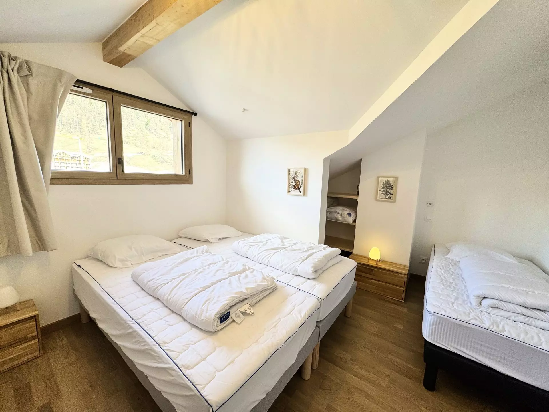 Il comprend deux chambres doubles avec des lits en 160x200, chacune dotée de deux ouvertures offrant une superbe luminosité, ainsi que deux salles d'eau et deux WC pour votre confort. Vous apprécierez également la grande terrasse exposée sud/ouest, idéale pour savourer votre petit-déjeuner ou vos apéritifs tout en profitant de la vue imprenable sur les montagnes.