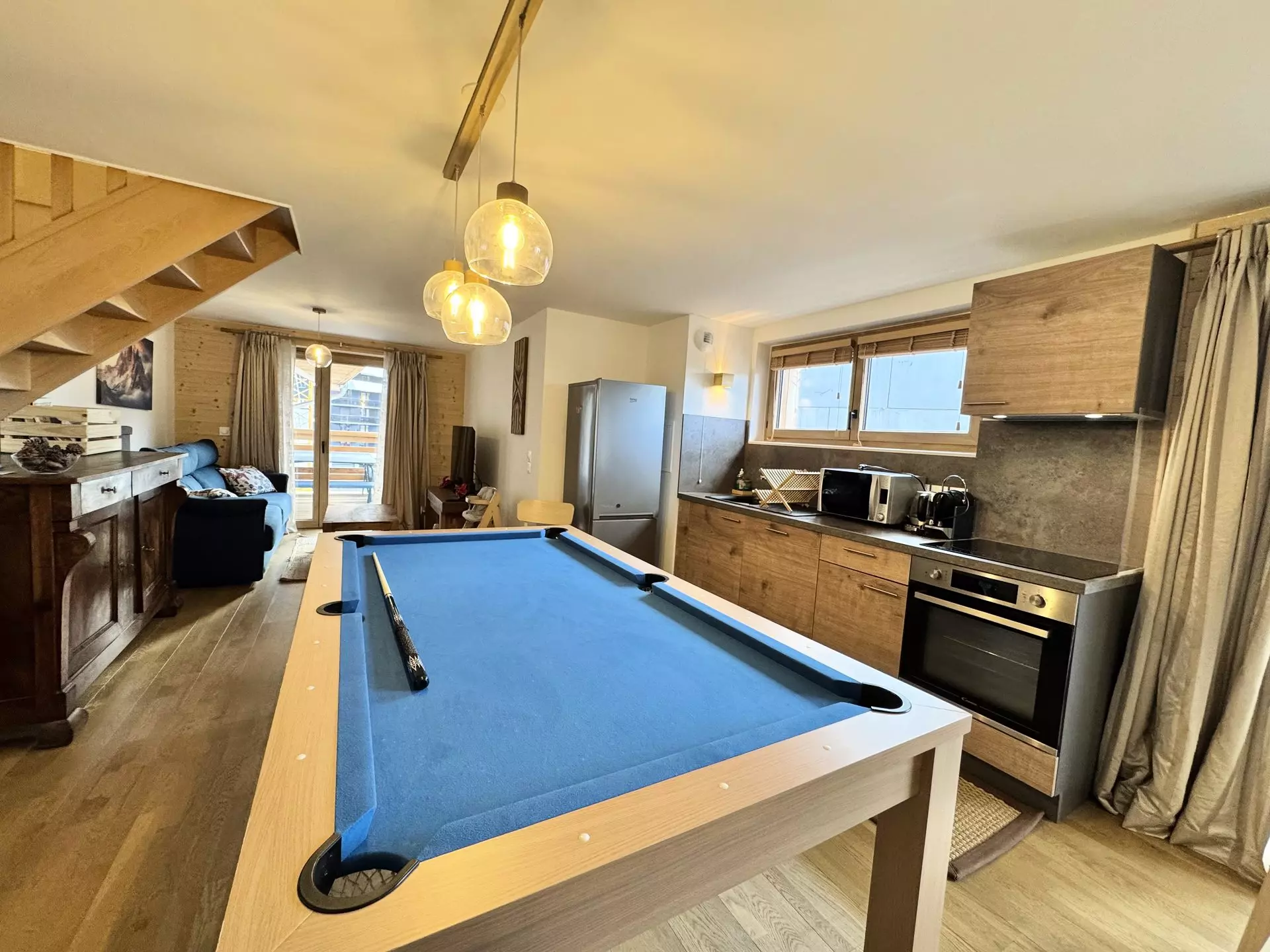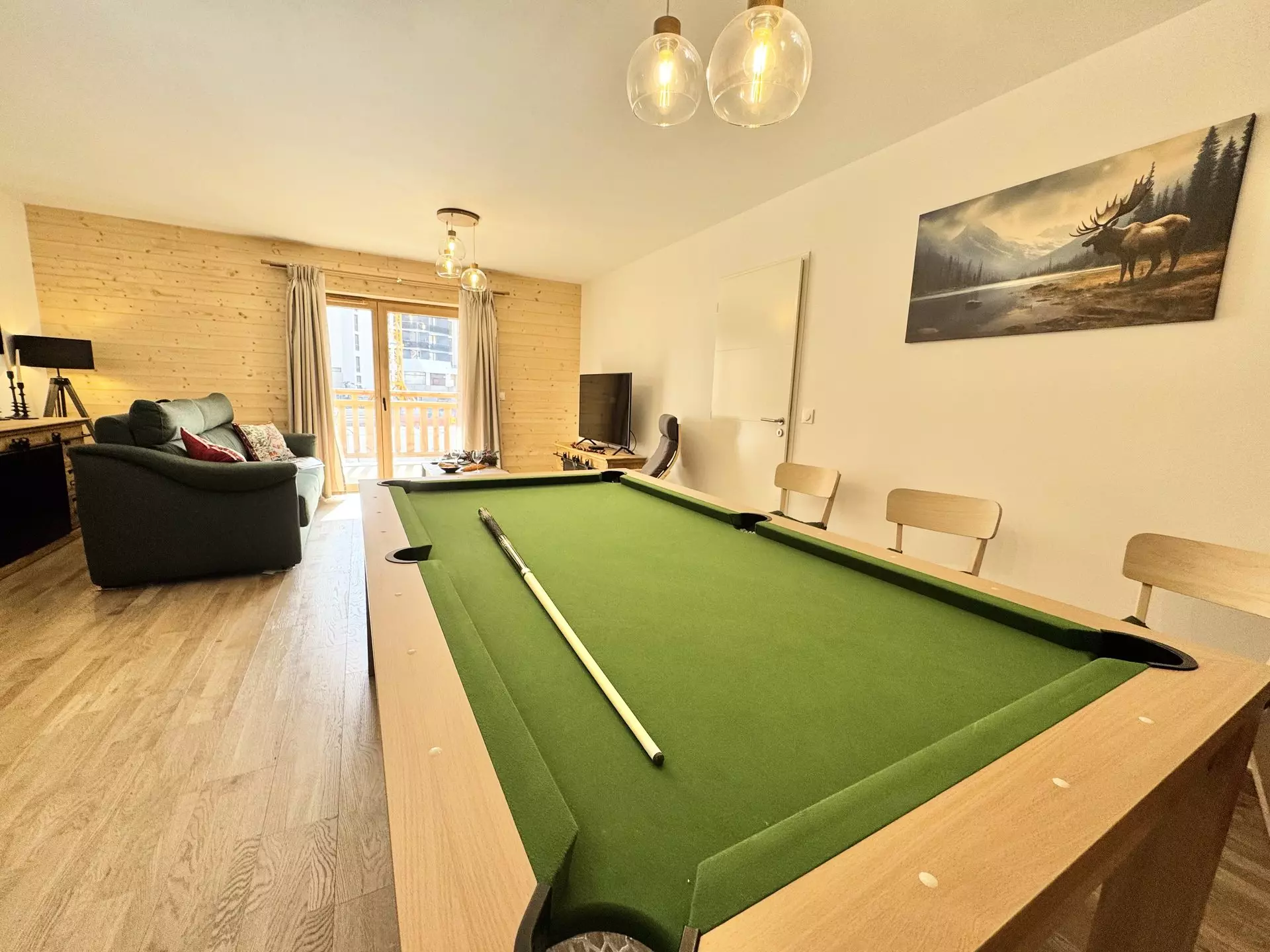 Les points forts de cet appartement incluent un grand espace de vie traversant de lumière, une grande terrasse et un balcon traversant, offrant une vue imprenable sur les montagnes environnantes. De plus, une table transformable en billard apportera une touche ludique à vos soirées.