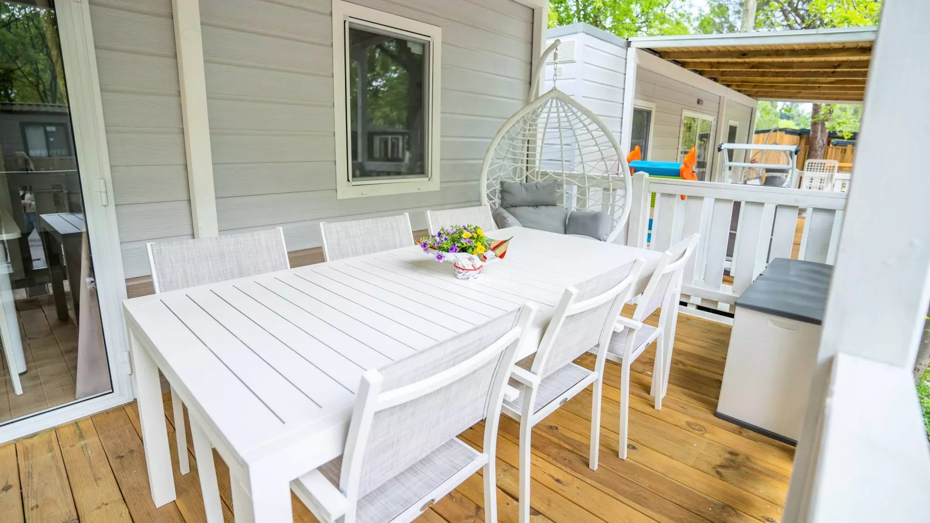 - Coin extérieur : terrasse en bois entièrement couverte est aménagée avec une table, des chaises, deux chaises longues ou chaises inclinables, un fauteuil suspendu, un barbecue ou une petite plaque électrique