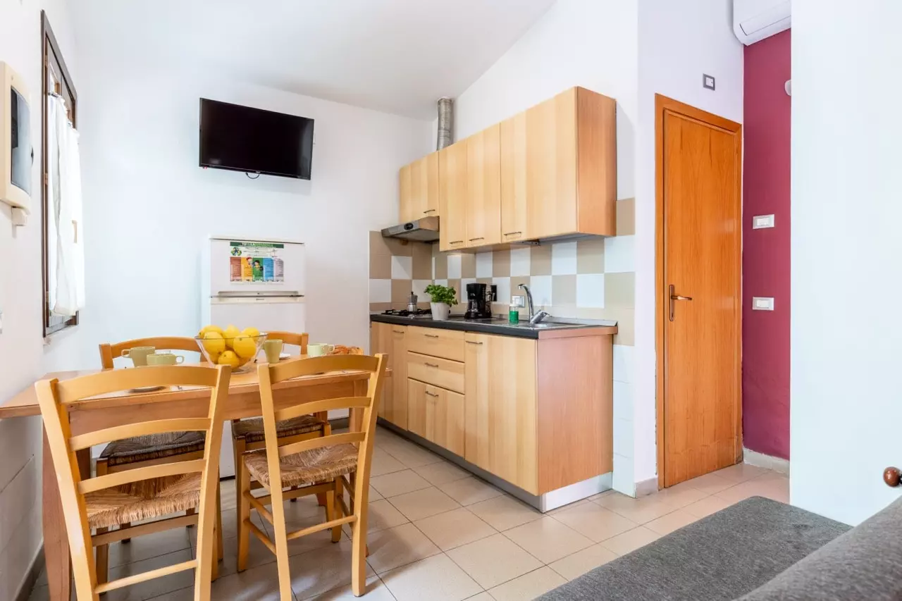For your stay, choose one of our Premium apartments! Constructed in brickwork and designed to accommodate up to 5 persons, these 35 m2 apartments are the ideal solution for families or groups of friends looking for a superior quality stay. The spacious living area features a modern and functional kitchenette, complete with all the accessories needed to prepare and enjoy meals independently either indoors or on our outdoor patio. This area extends elegantly towards the loft and the sofa. The latter, separated by a practical blackout curtain, can be easily transformed into a comfortable double bed, providing privacy and comfort during the night's rest. The loft bed, an exclusive design for our Camping Village, adds a touch of originality and makes the most of vertical space. Each apartment is equipped with a bathroom with shower, refrigerator, satellite TV, hairdryer and air conditioning with inverter. In addition, all our flats have a furnished patio where you can comfortably dine or relax on sun loungers.