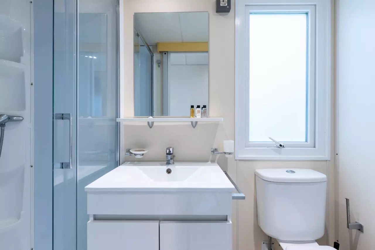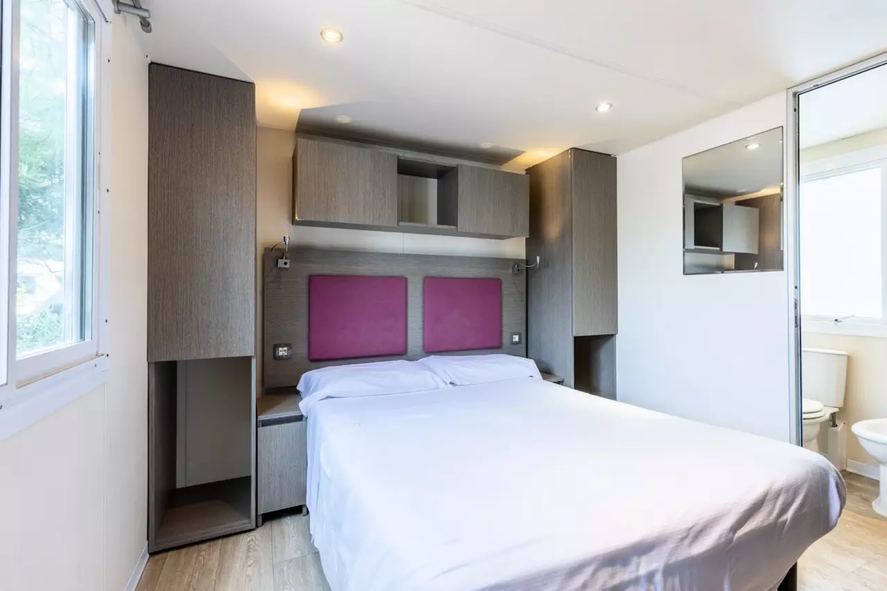 Les mobil-homes sont des structures modernes et confortables disposant de2 chambres, dont une avec un grand lit et l'autre avec deux lits jumeaux.Chaque chambre est équipée d'une salle de bain avec douche.