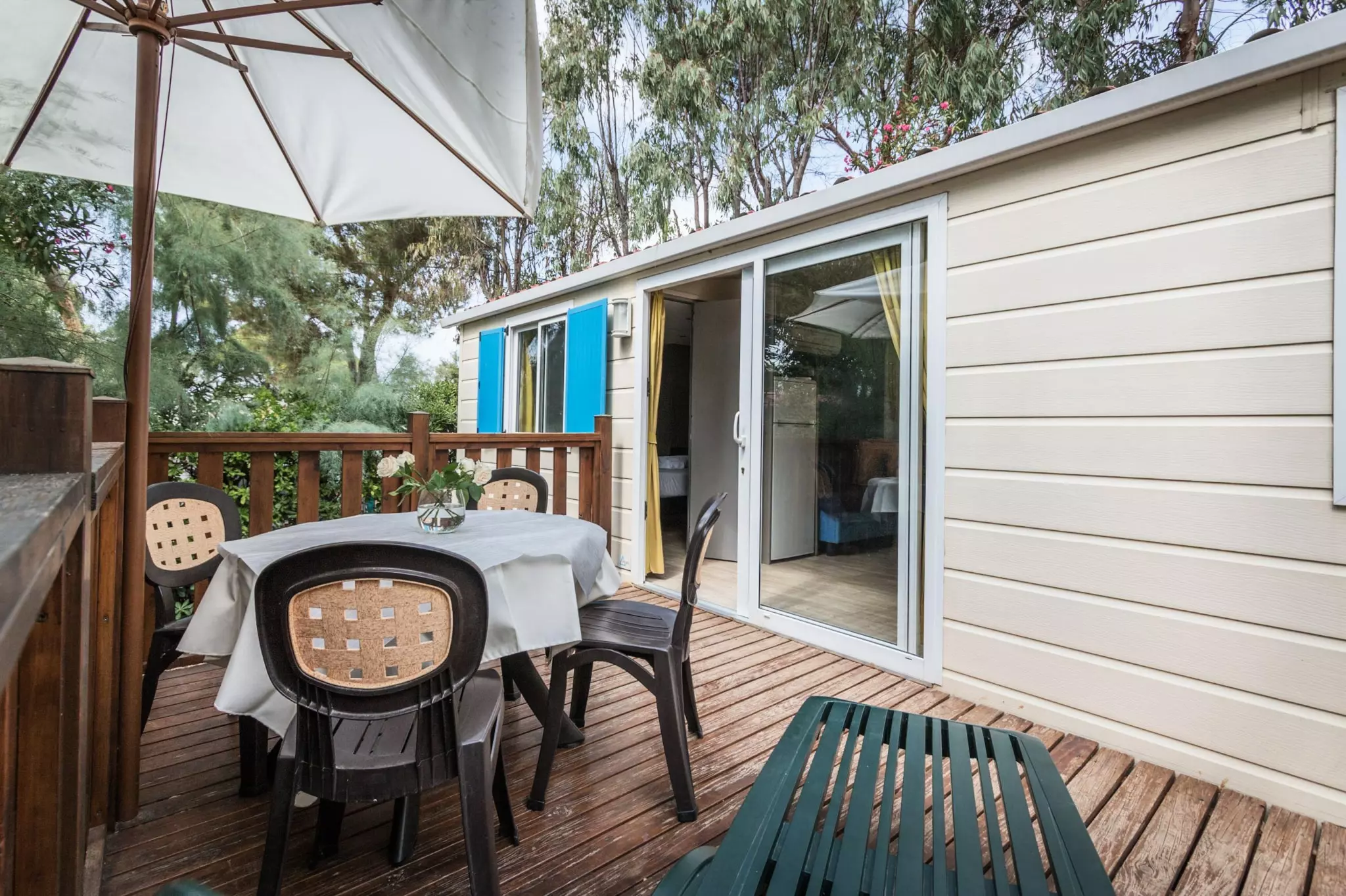 Chaque mobil-home dispose d'une terrasse privative avec une table et 4 chaises, ainsi qu'une chaise-longue pour se prélasser au soleil.