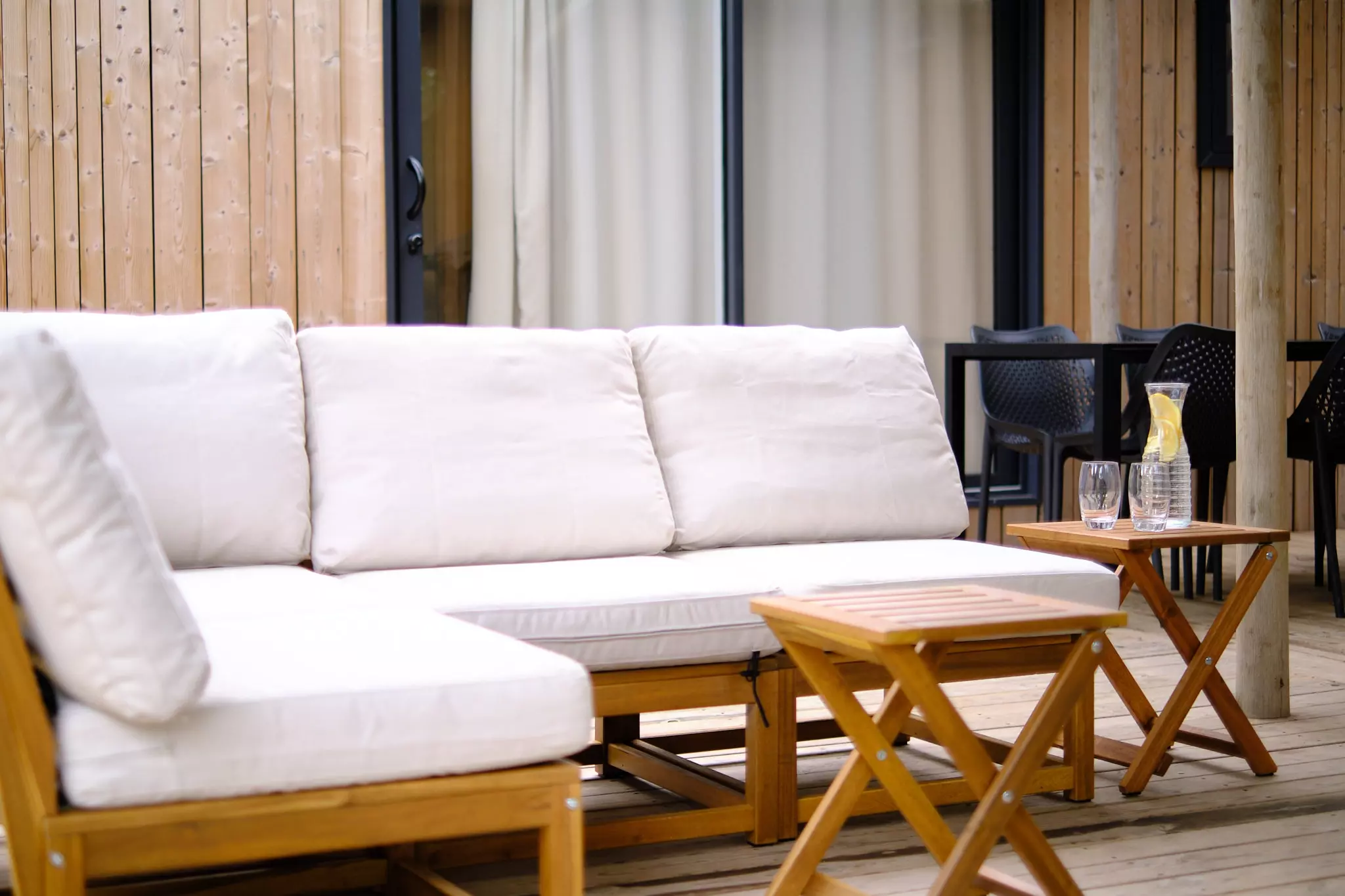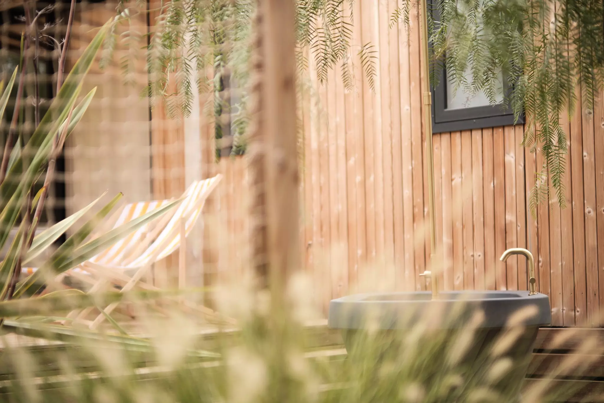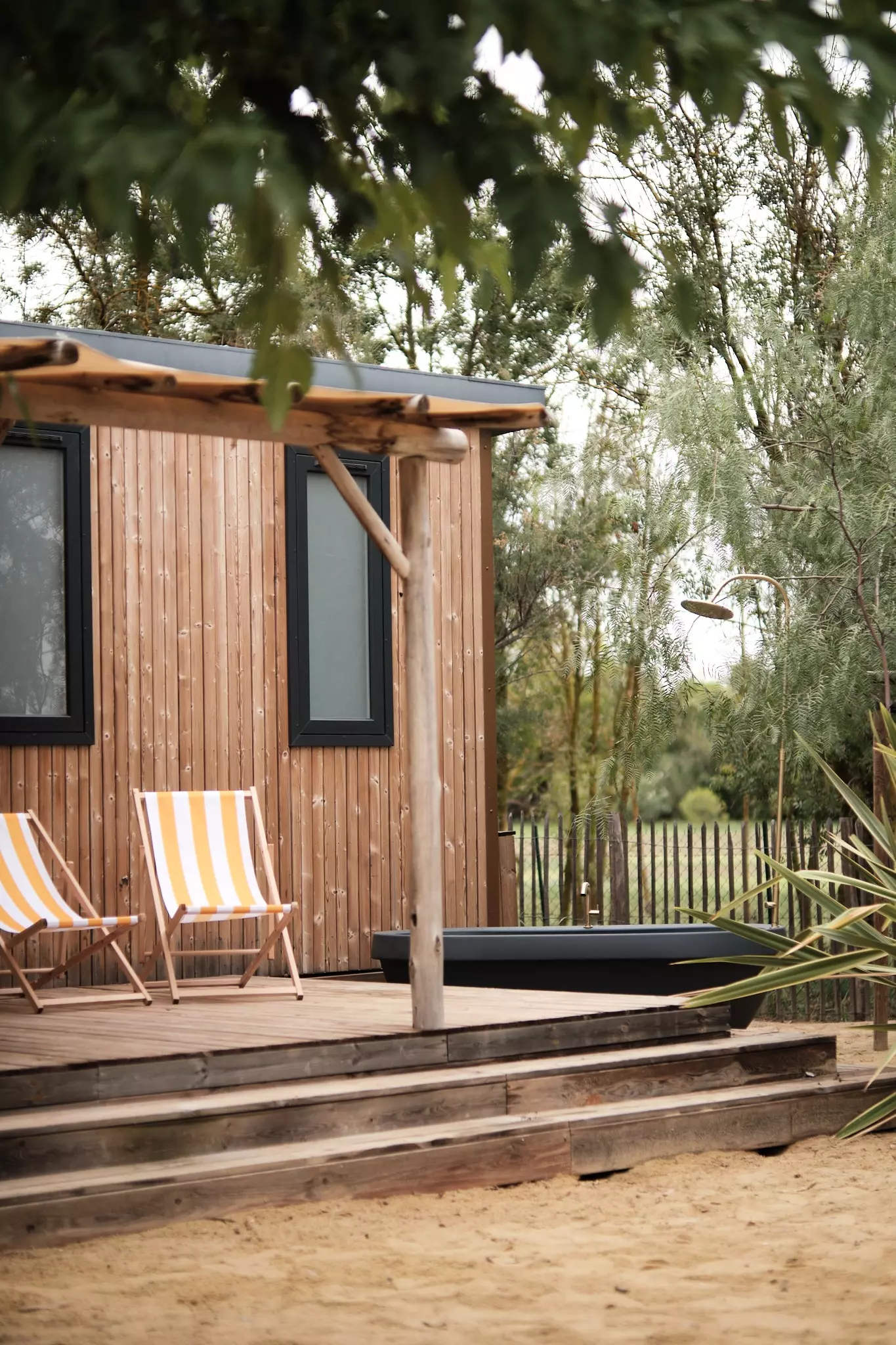 Chaleureux et pratique, idéal pour une famille ou deux couples. À l'intérieur, vous trouverez un séjour lumineux, une cuisine ouverte entièrement équipée et deux chambres. La salle de bain dispose d'une douche, et il y a des toilettes séparées. Il s'agit d'un lodge bien-être, avec une baignoire extérieure exclusive juste à côté de votre lodge. Profitez d'un bain glacé revigorant ou d'un bain chaud sous le ciel ouvert. À l'extérieur, votre terrasse privée avec mobilier de jardin est l'endroit parfait pour se détendre ensemble.