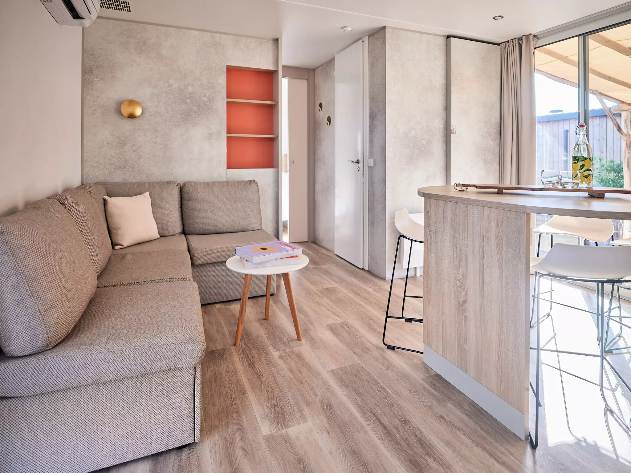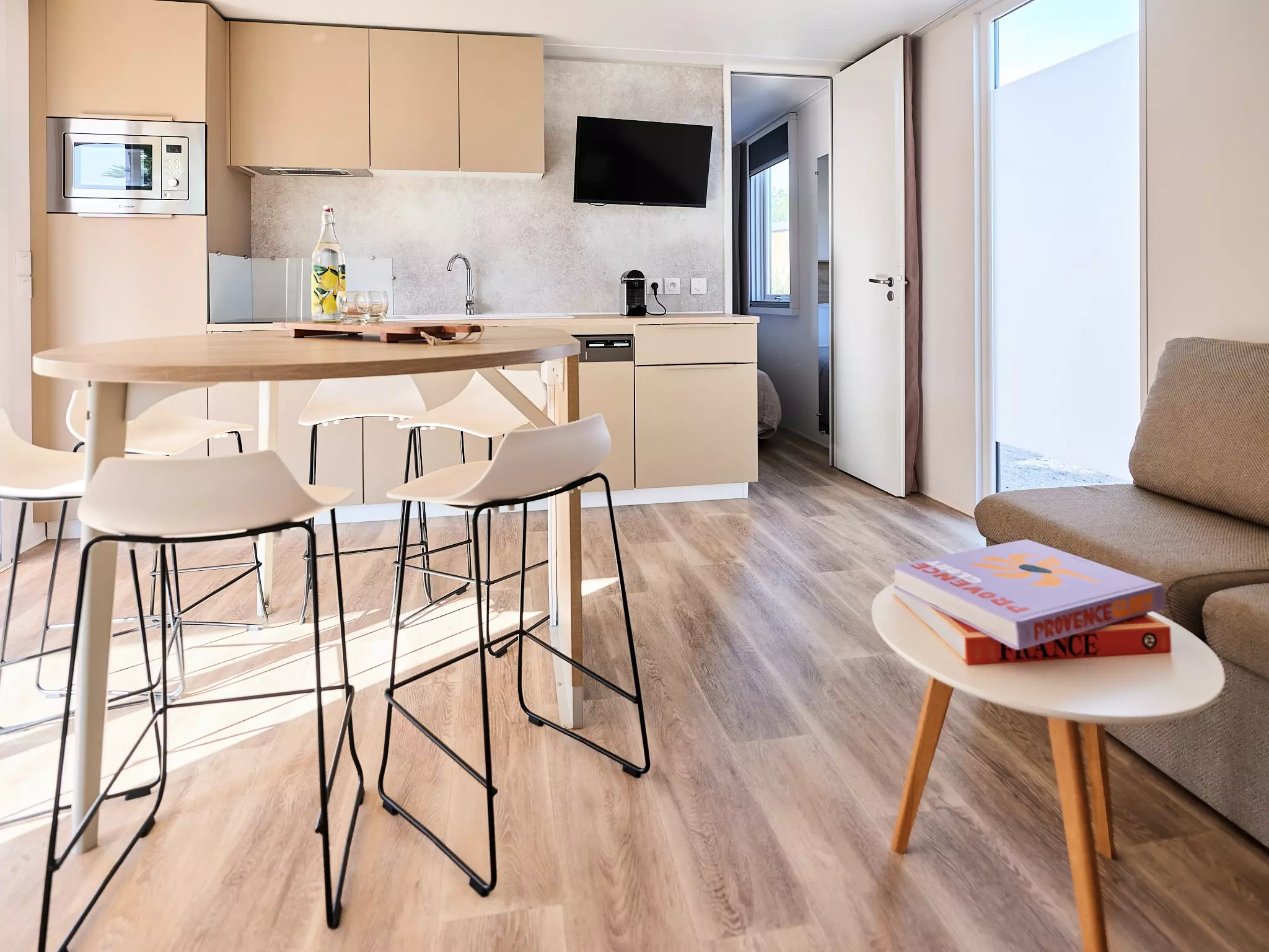 Ce lodge est entièrement accessible et de plain-pied, ce qui permet à chacun de profiter d'un séjour en toute tranquillité. À l'intérieur, vous trouverez un séjour lumineux avec un coin salon, une cuisine ouverte avec tous les essentiels, ainsi que deux chambres. La salle de bain spacieuse est équipée d'aménagements adaptés pour plus de confort. À l'extérieur, une terrasse privée avec mobilier de jardin vous attend, ainsi qu'une place de parking juste à côté du lodge.