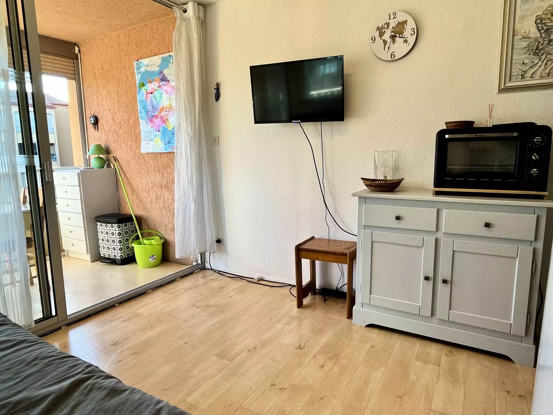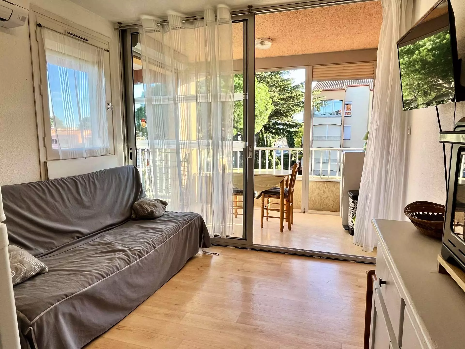 Cette location dans le sud ,située au deuxième étage, exposée Sud/Est, se compose d'un séjour avec canapé convertible 2 places , une cabine avec un lit deux places,un coin cuisine équipé, une salle d'eau avec WC.