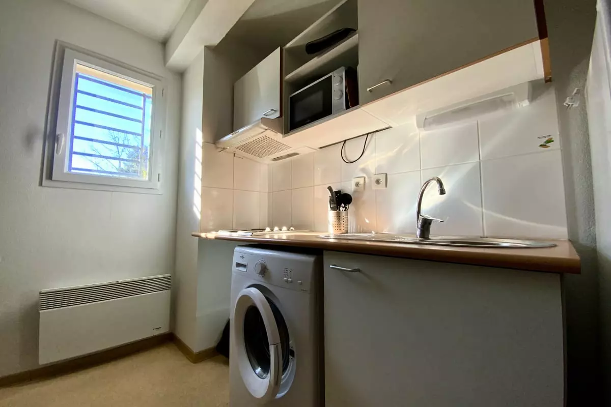 * Une grande pièce de vie ouverte avec sa cuisine toute équipe (frigo combiné, machine à café filtre, bouilloire, plaque, hotte, lave linge et toute la vaisselle nécessaire), un espace repas avec table et chaise, un canapé lit en 140 X 190 un télévision et l’accès wifi gratuit. L’espace de vie donne sur une terrasse extérieur avec mobilier de jardin