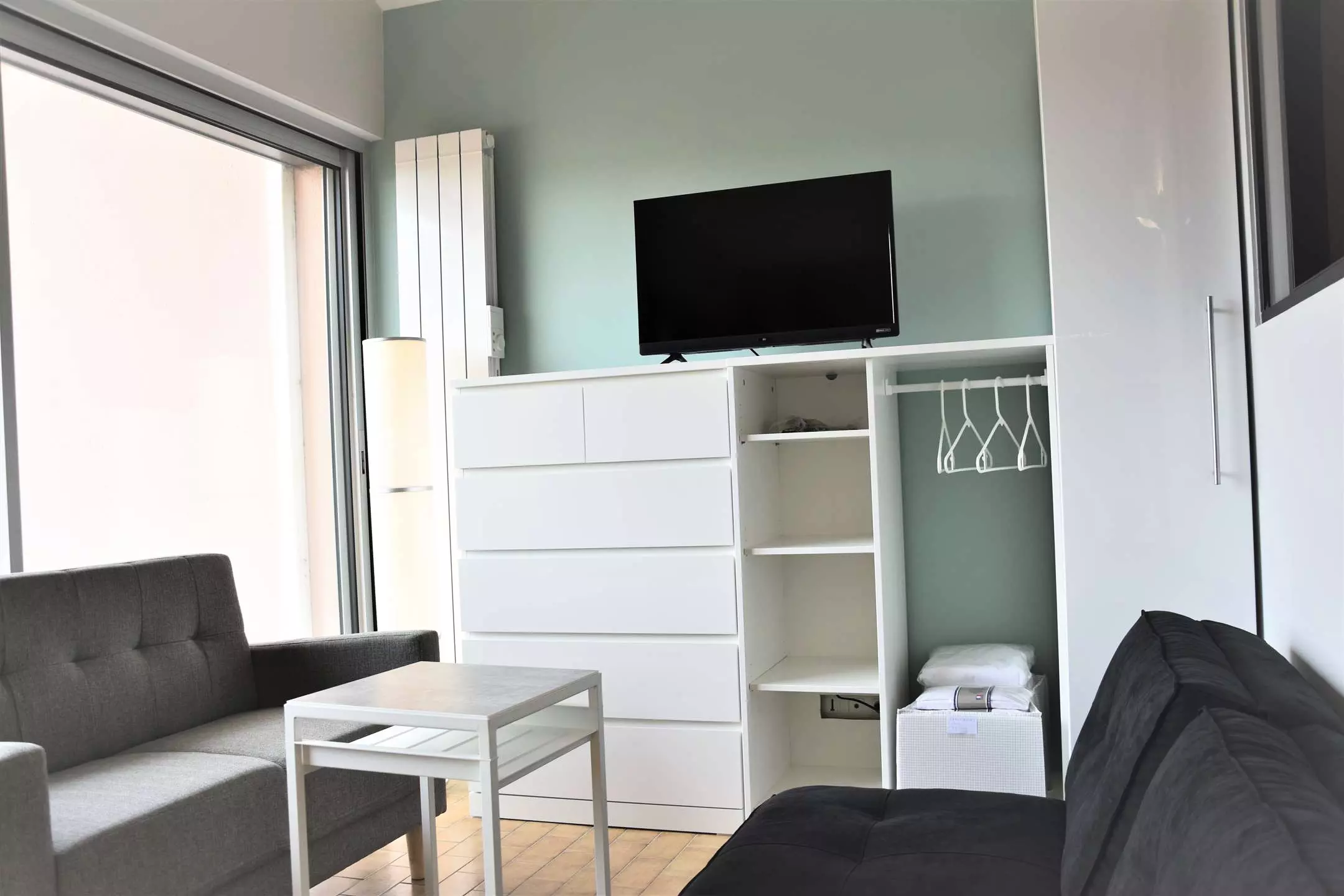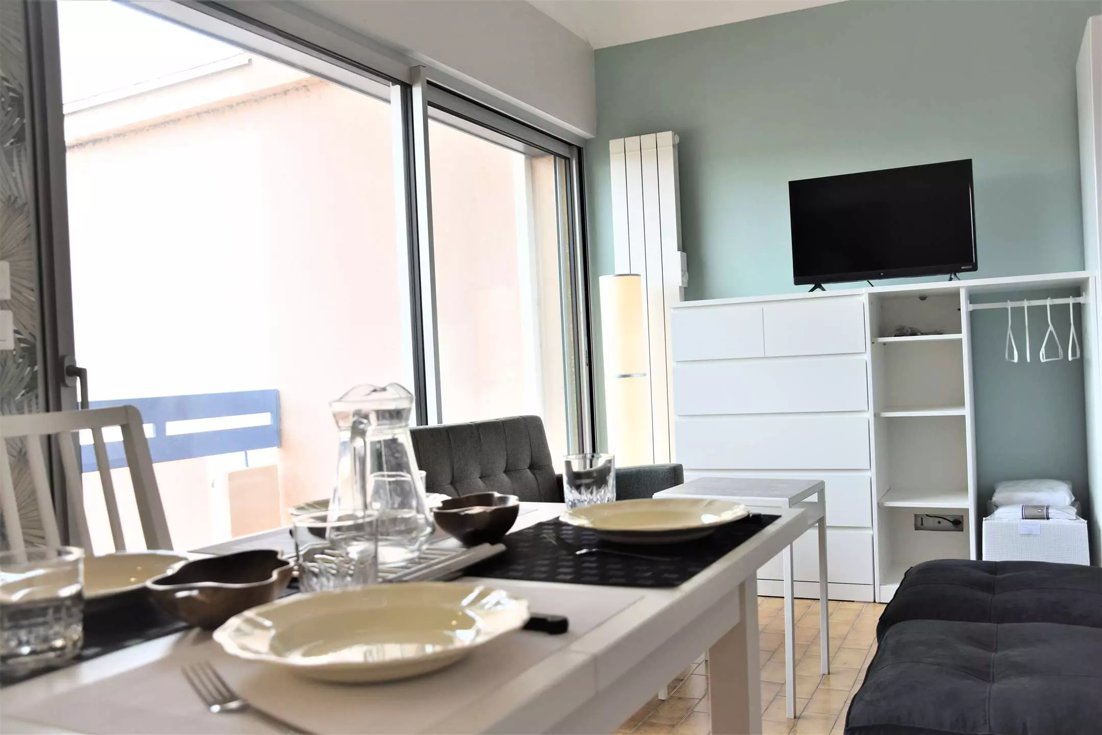 Situé au deuxième étage ce logement de vacances climatisé entièrement rénové en 2021 se compose d'un séjour avec Kitchenette toute équipée donnant accès sur le balcon par de grandes baies vitrées , il offre un canapé non convertible , télévision, rangements , coin repas amovible et 2 couchages d'appoints ( style chauffeuse 80*100 = idéal pour enfants et jeunes adolescents) ; une salle d'eau avec wc, suivi d'une chambre avec un couchage 140*190 .