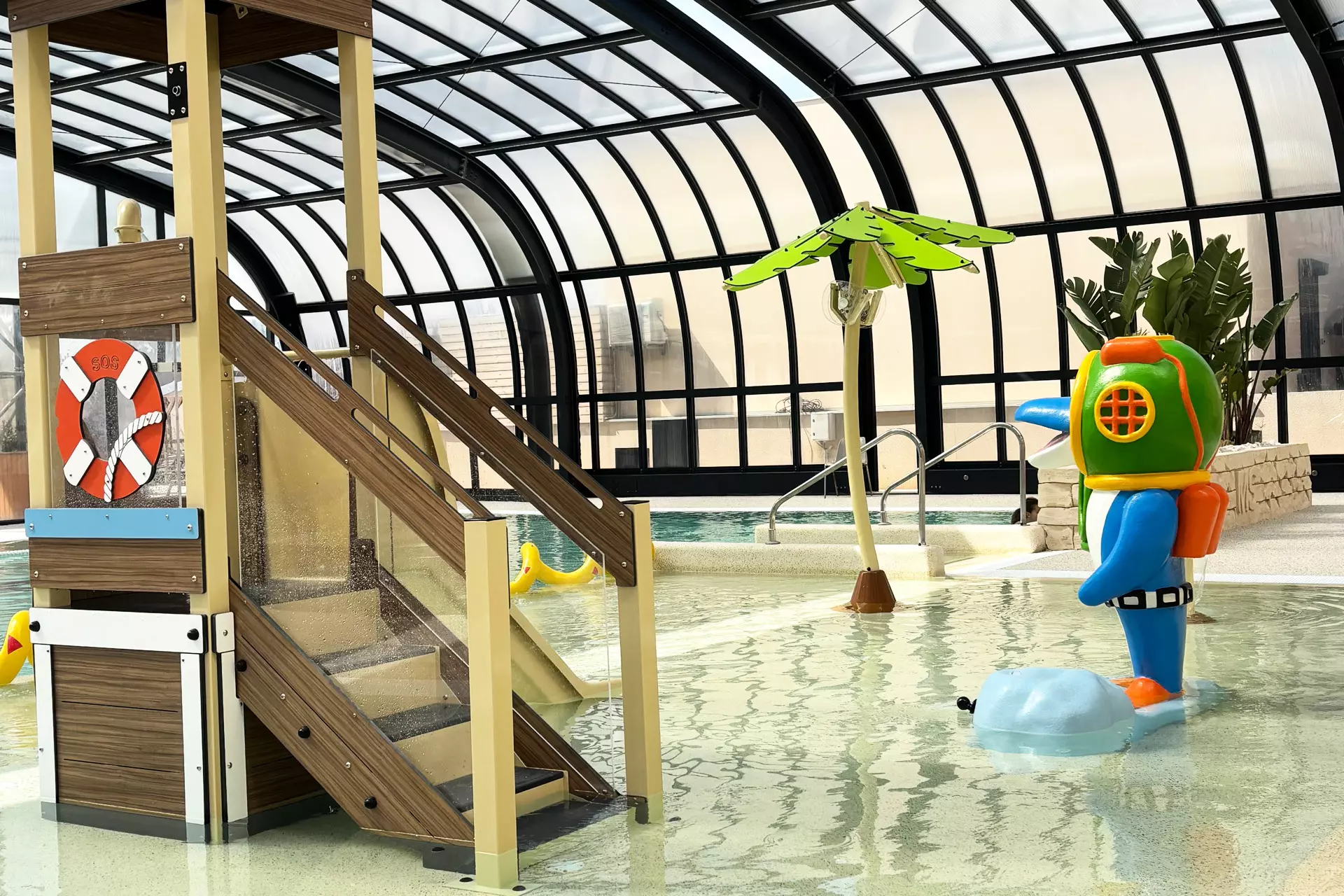 extérieur 950m² avec piscines - pataugeoire - jardin d'eau - 4 toboggans dont 1 "Wave à bouée" - solarium - piscines extérieures chauffées toute la saison - piscine à vagues - rivière sauvage - ouverte toute la saison - en accès libre de 10h à 19h (20h en haute saison)