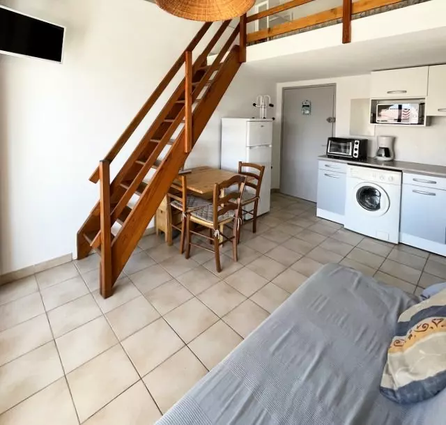 Situé à 300 m de la plage et 200 m du centre ville, appartement T2 Mezzanine, 30.05 m² équipé pour 4 personnes situé au 2 ème étage.