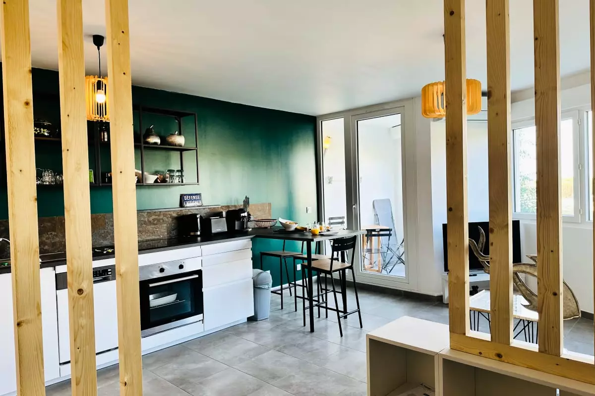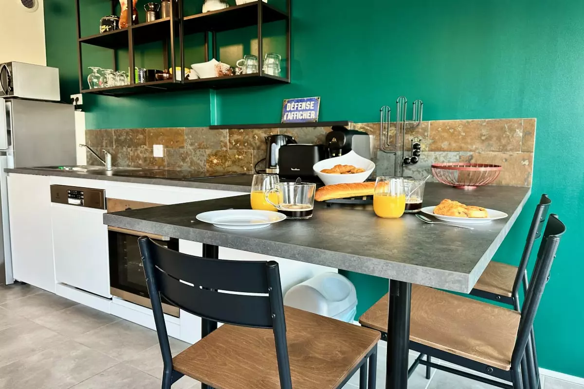 Cuisine ouverte et entièrement équipée : Machine à café, bouilloire, grille-pain, four, micro-ondes, réfrigérateur, ustensiles etc