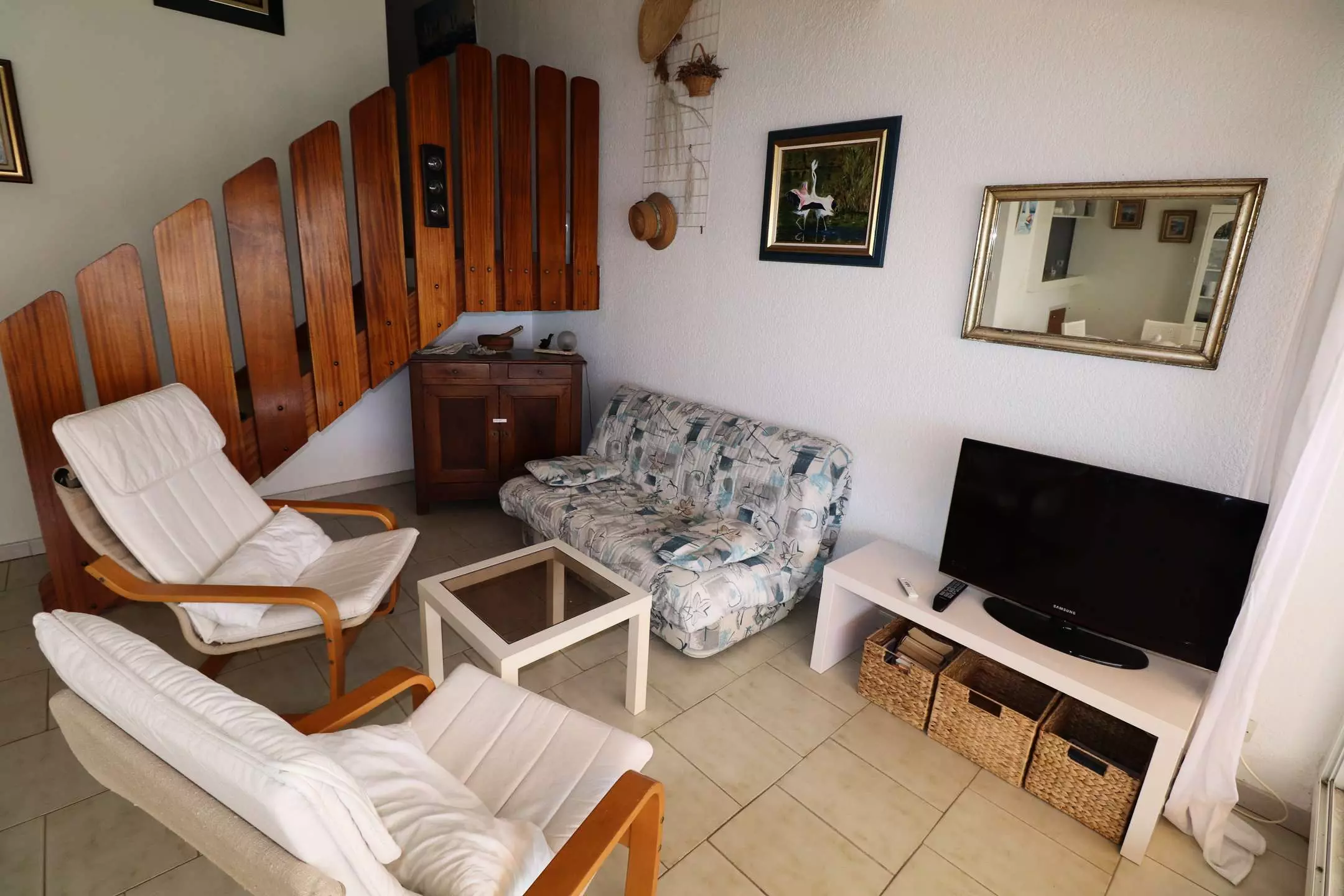 Idéale pour des vacances agréables, elle comprend au premier niveau une grande chambre composée d'un lit double de 140x190 ainsi que 2 lits superposés de 70x140, une salle d'eau avec Wc séparés et lave-linge.