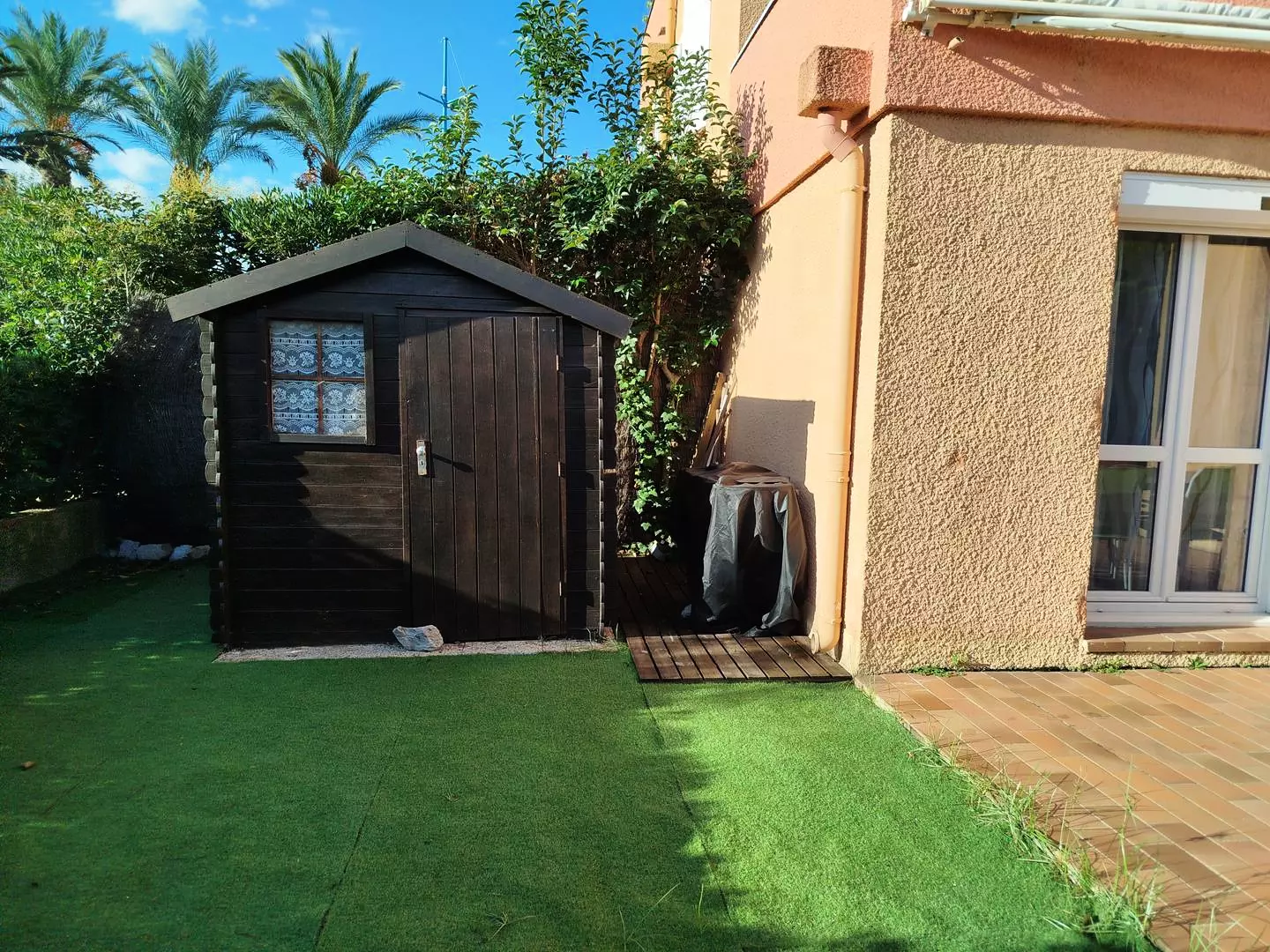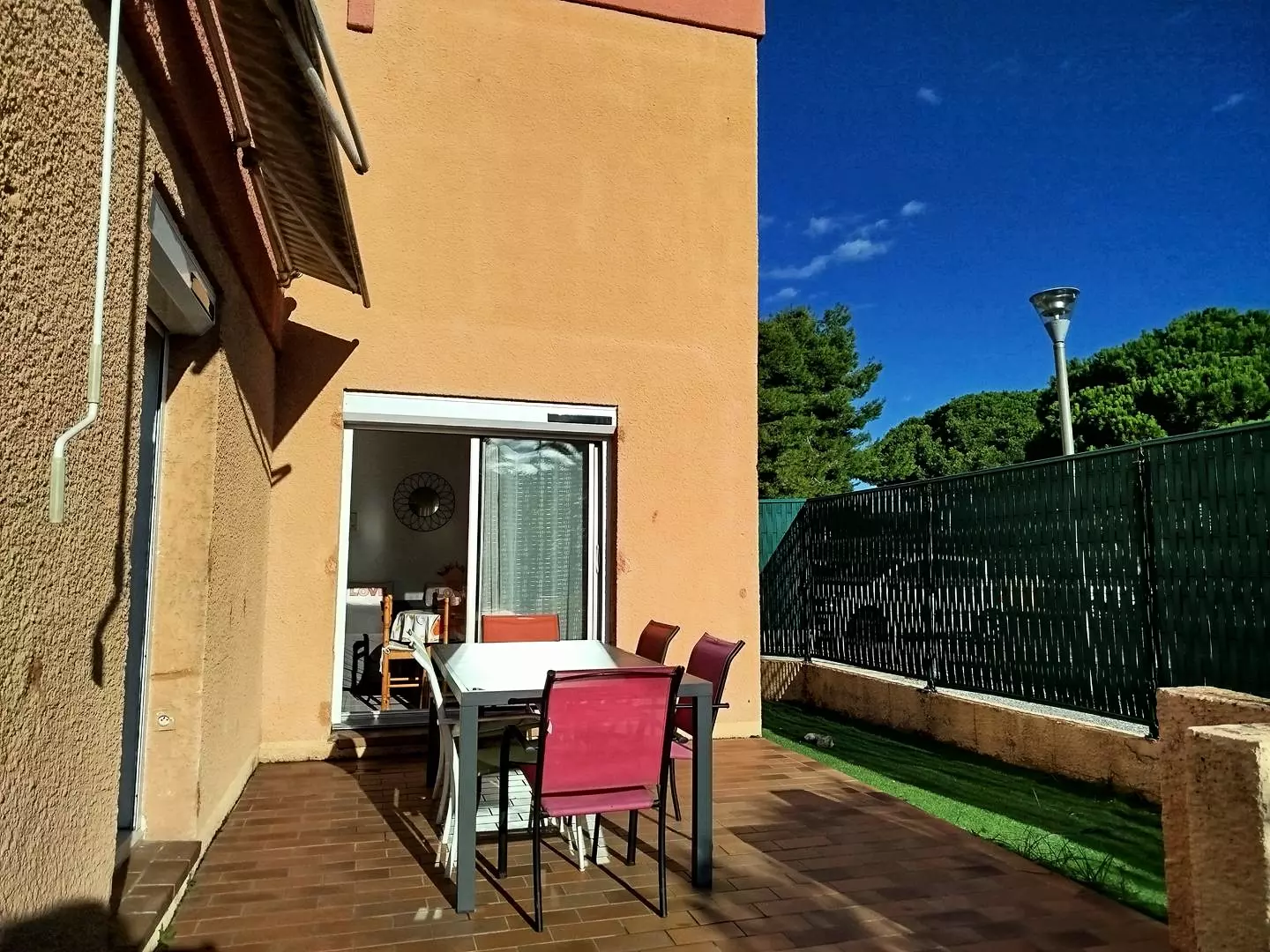 Terrasse (Store banne) avec salon de jardin, barbecue gaz ou plancha. Volets roulants électriques.