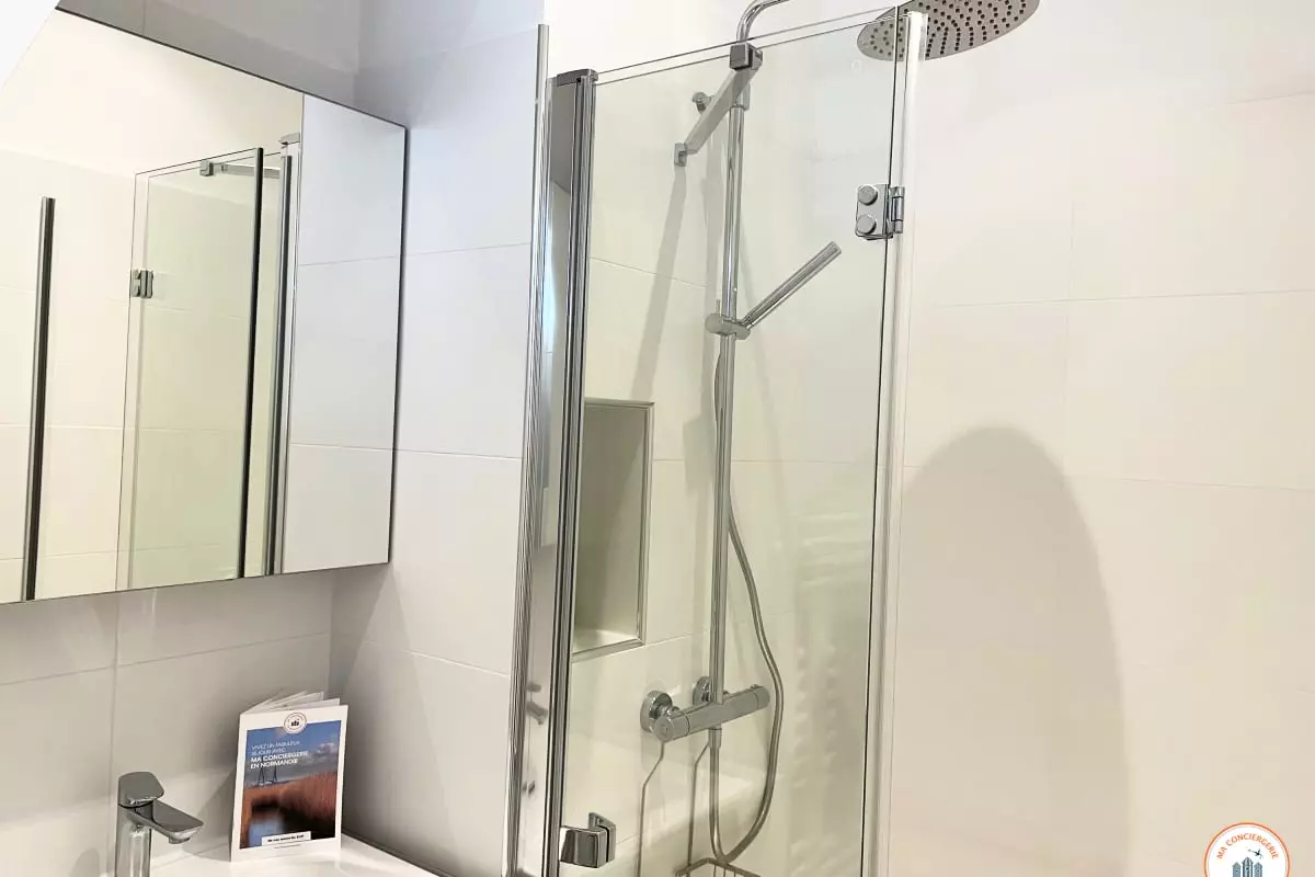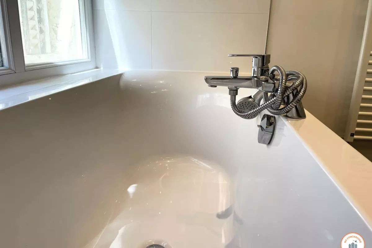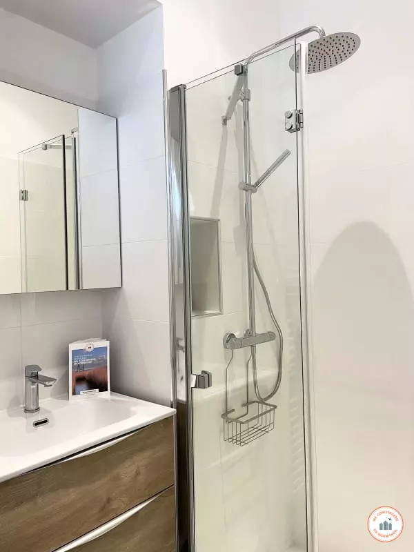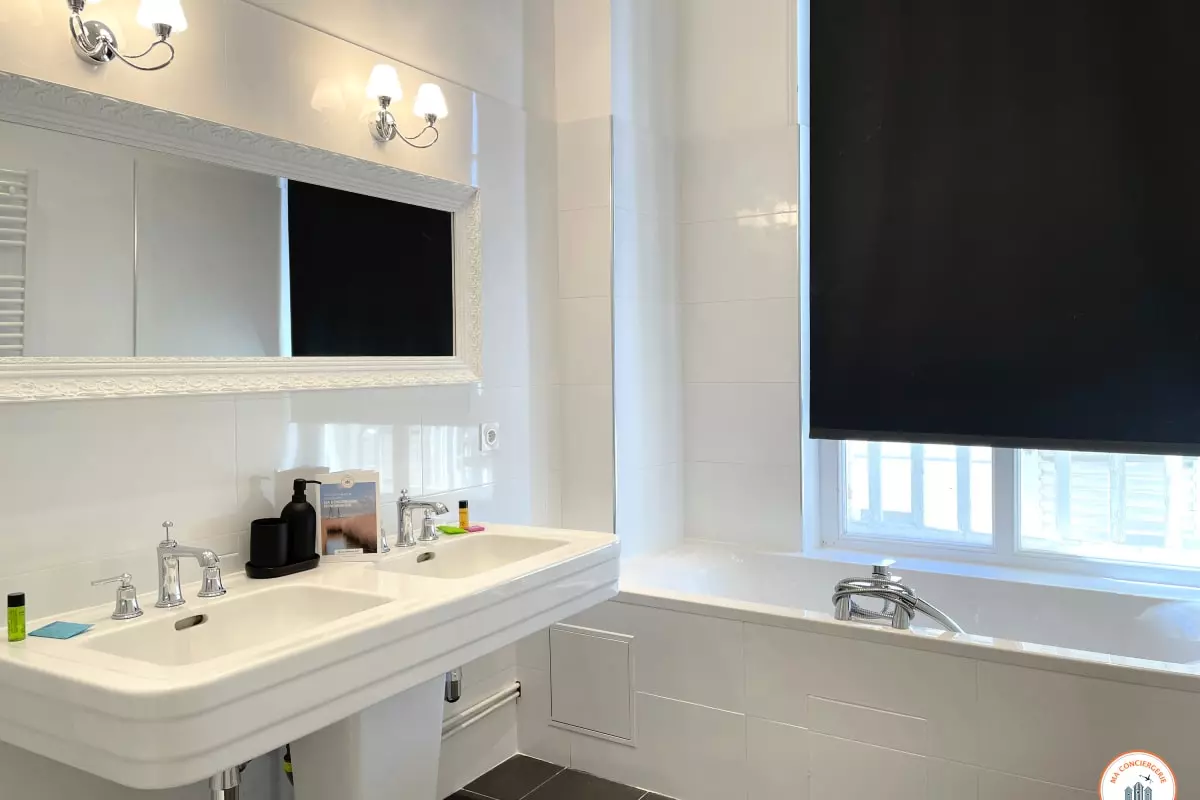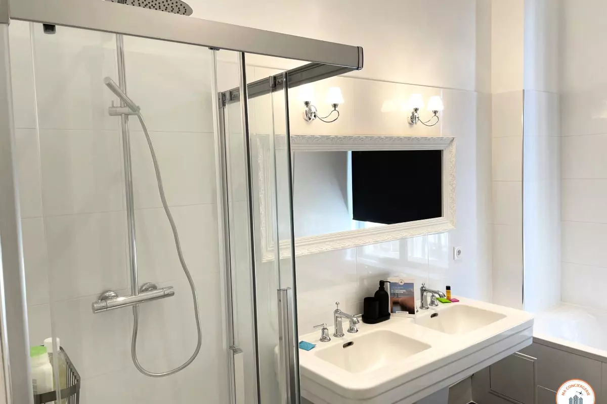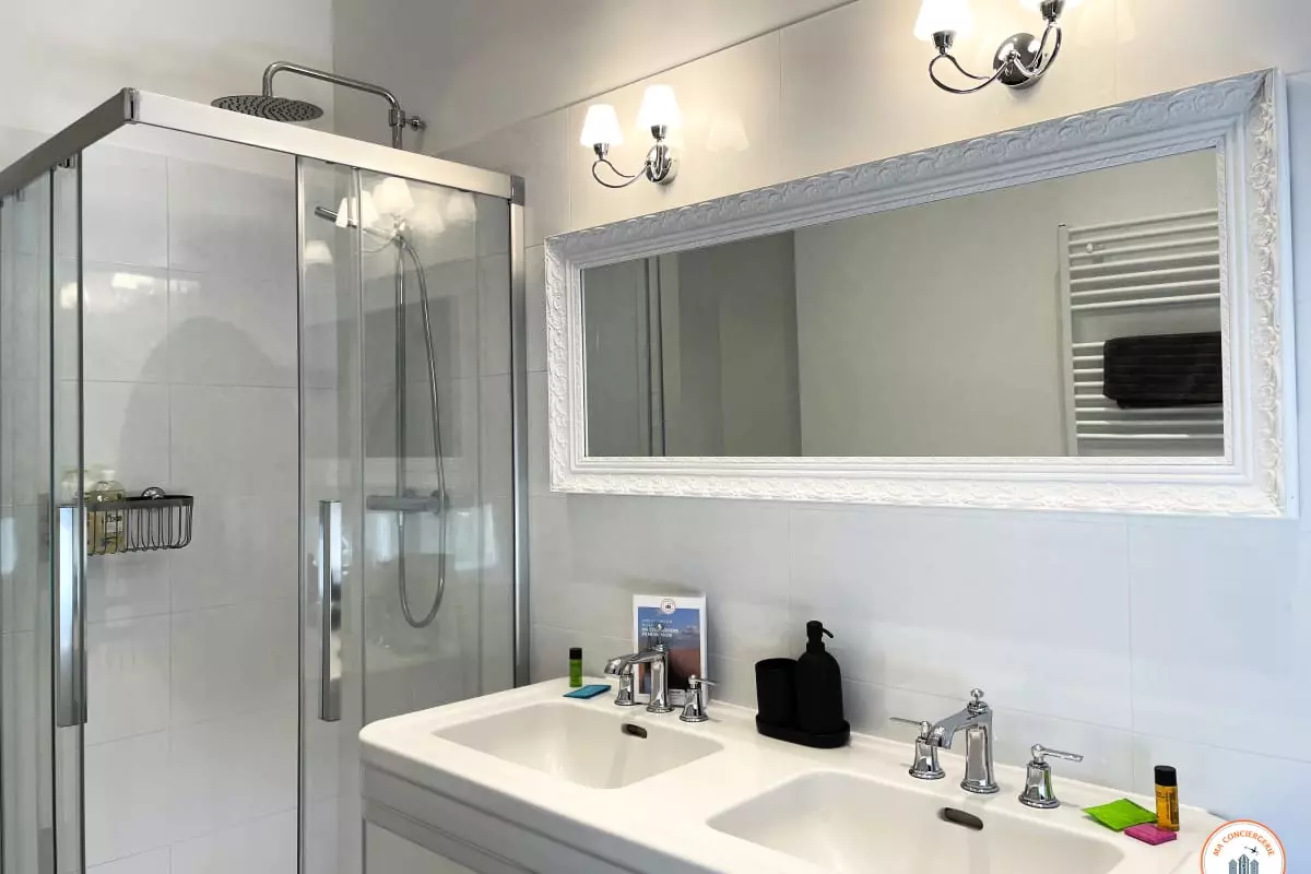 - 2 salles de bain : la première, très spacieuse, vous offrira 1 douche + 1 baignoire, la seconde, plus petite vous offrira 1 douche avec ciel de pluie.