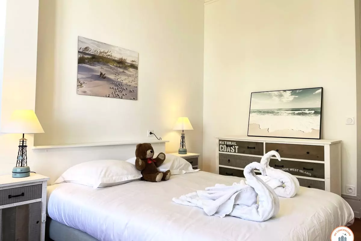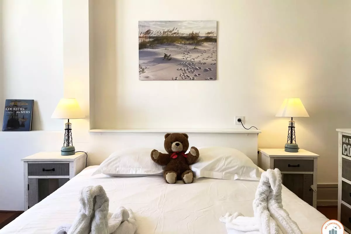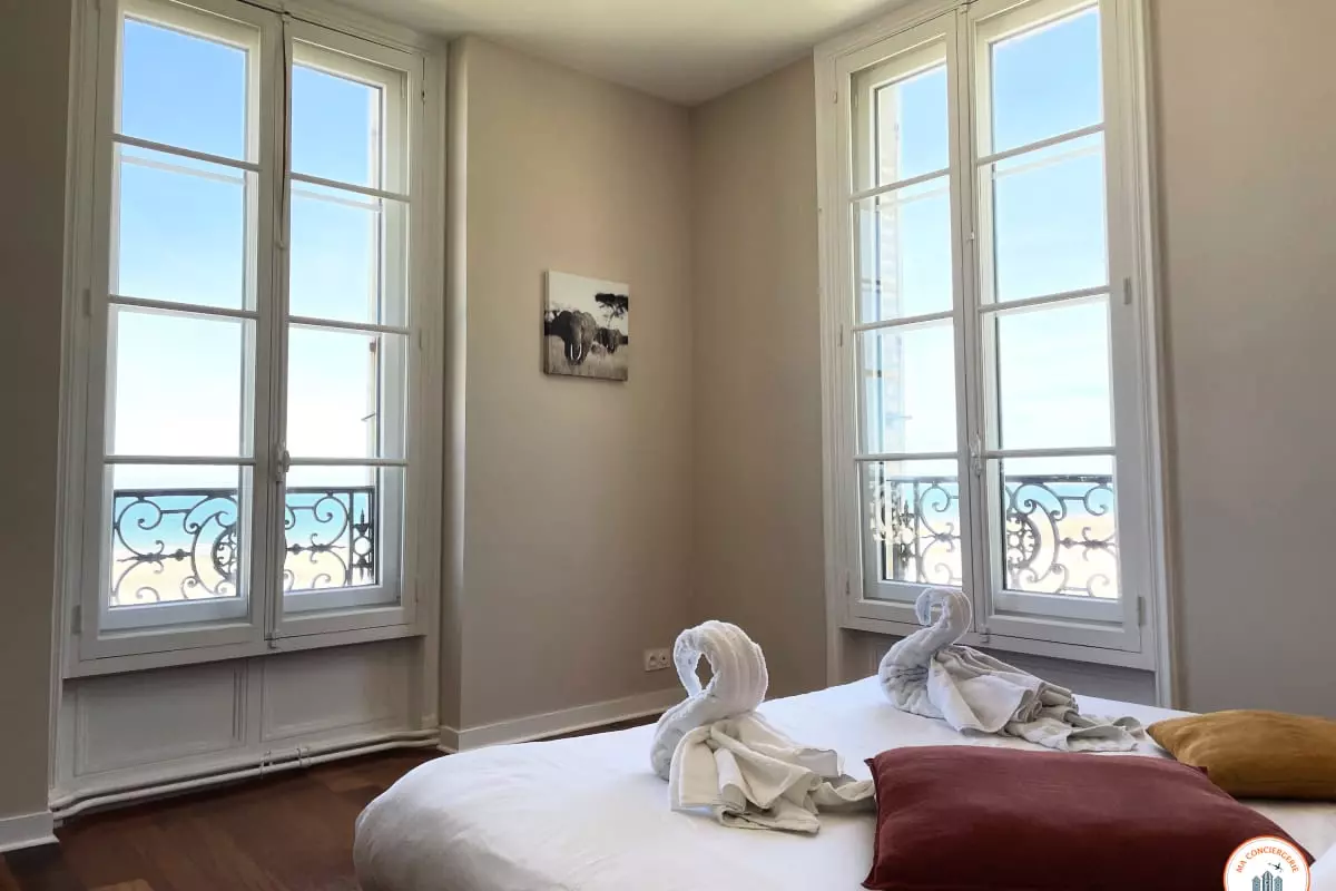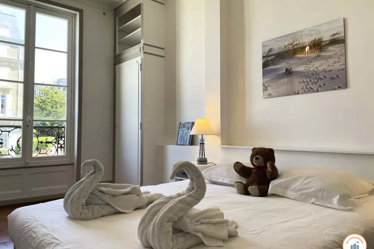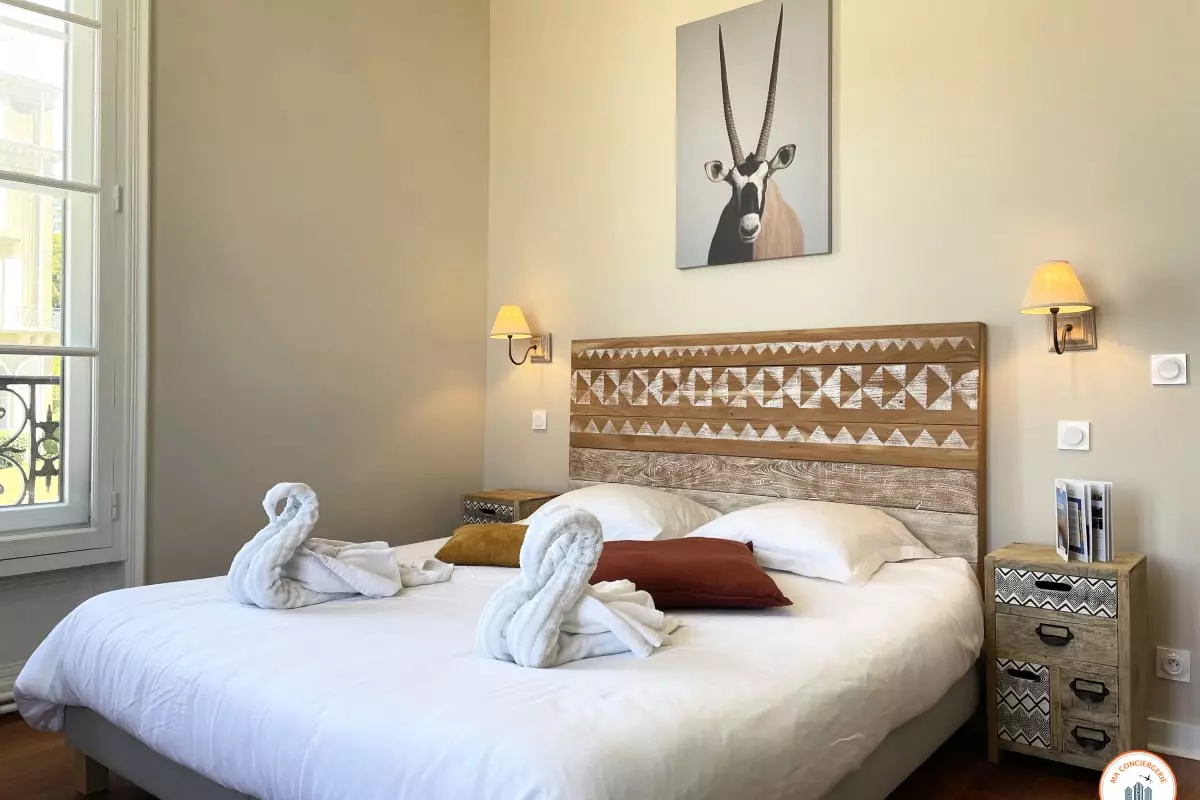 - 1 grande chambre avec vue sur le jardin des Roches Noires équipée d'un lit Queen size en 160x200cm et d'un dressing.