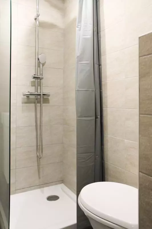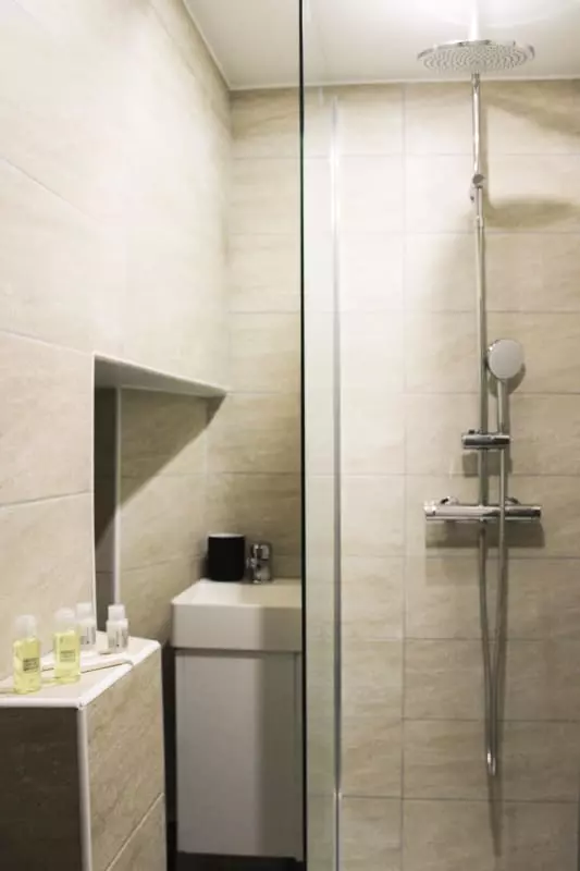 - une petite salle d'eau avec une entrée étroite. Le lavabo présent est accessible aux personne de petites corpulences. Autrement, il y a l'évier de la cuisine.