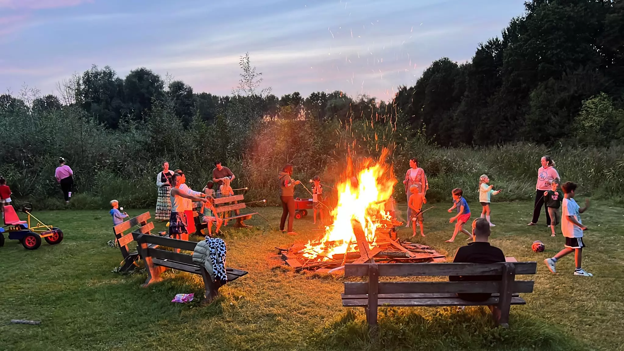 Le terrain de jeu est équipé d'un bac à sable pour les plus petits, d'un but de football, d'un filet de volley-ball, de plusieurs tables de pique-nique idéales pour un barbecue "Green Egg" le soir et, enfin, d'une aire de feu de camp !