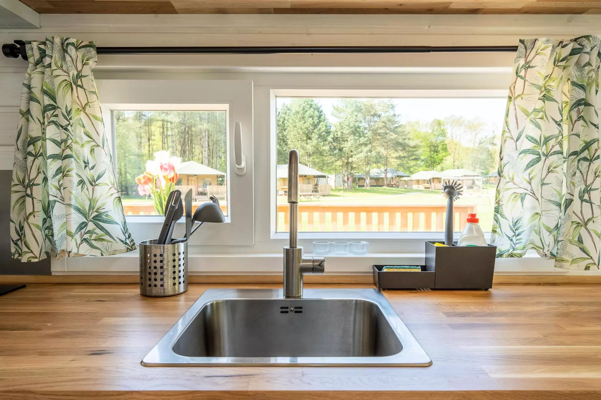 La Tiny House avec la tente de couchage Safari convient à une famille nombreuse. Comme la tente de couchage attenante avec des lits de qualité hôtelière est également utilisée, la Tiny House conserve une bonne partie de son espace de vie !