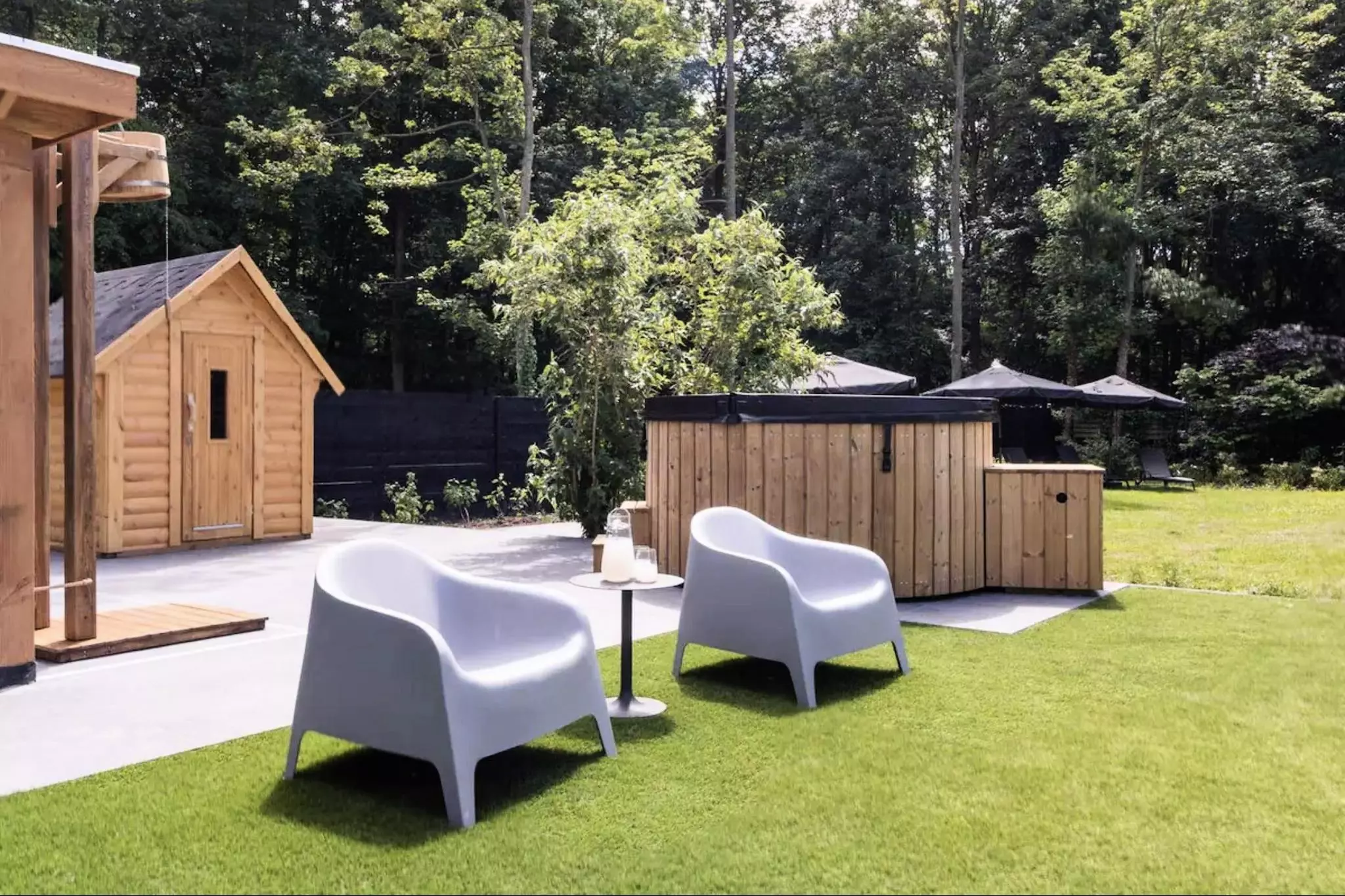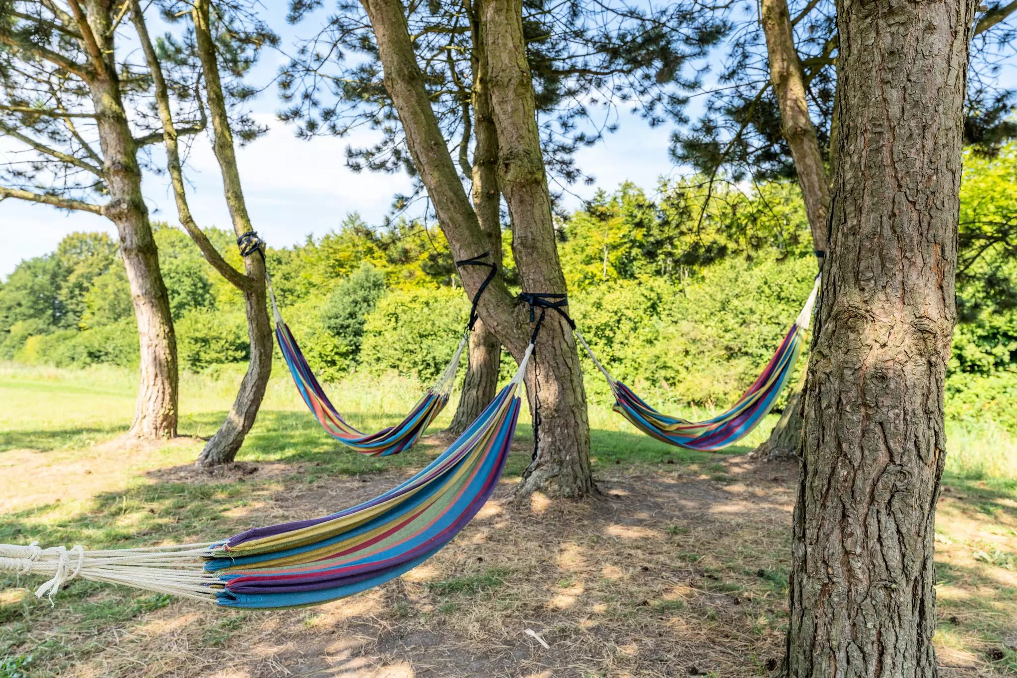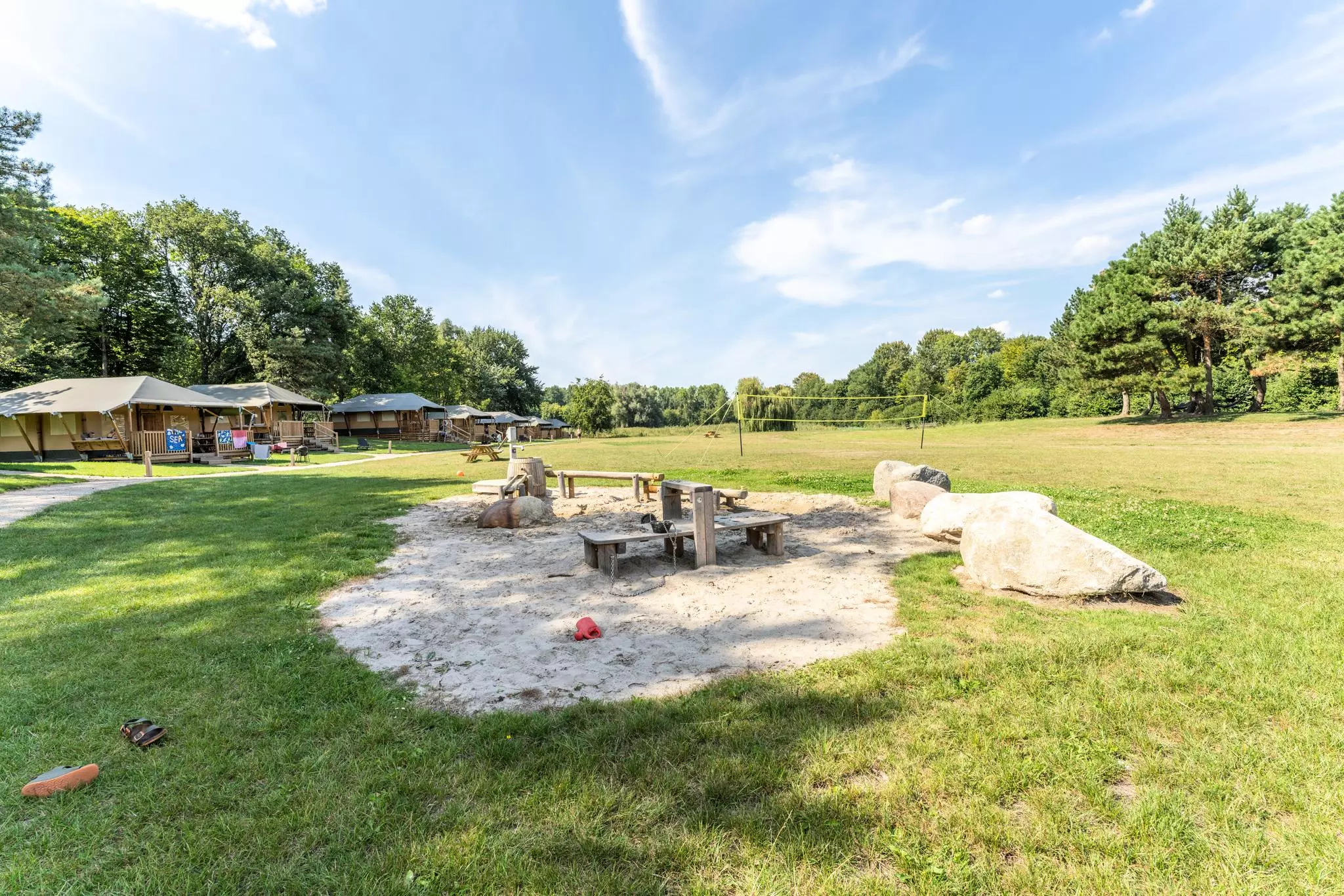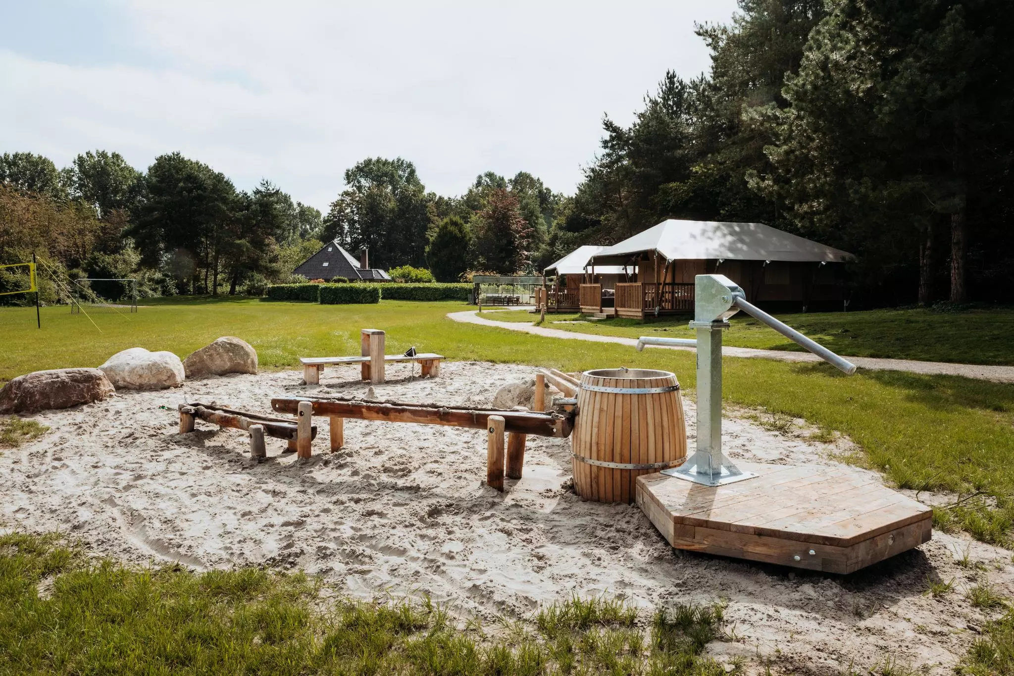 Le Glamping est situé au milieu d'une forêt sur un grand terrain de jeu. La villa se trouve à côté du terrain de jeu et est entourée d'une clôture, ce qui garantit l'intimité mais aussi un accès facile au terrain de jeu commun. Le terrain de jeu est équipé d'un dispositif de sable et d'eau pour les tout-petits, d'un but de football, d'un filet de volley-ball, de plusieurs tables de pique-nique idéales pour un barbecue "Green Egg" le soir et, enfin, d'un endroit pour faire un feu de camp ! À côté de la villa se trouve notre propre centre de bien-être écologique où vous pouvez vous détendre dans le sauna, le bain à remous ou la piscine.