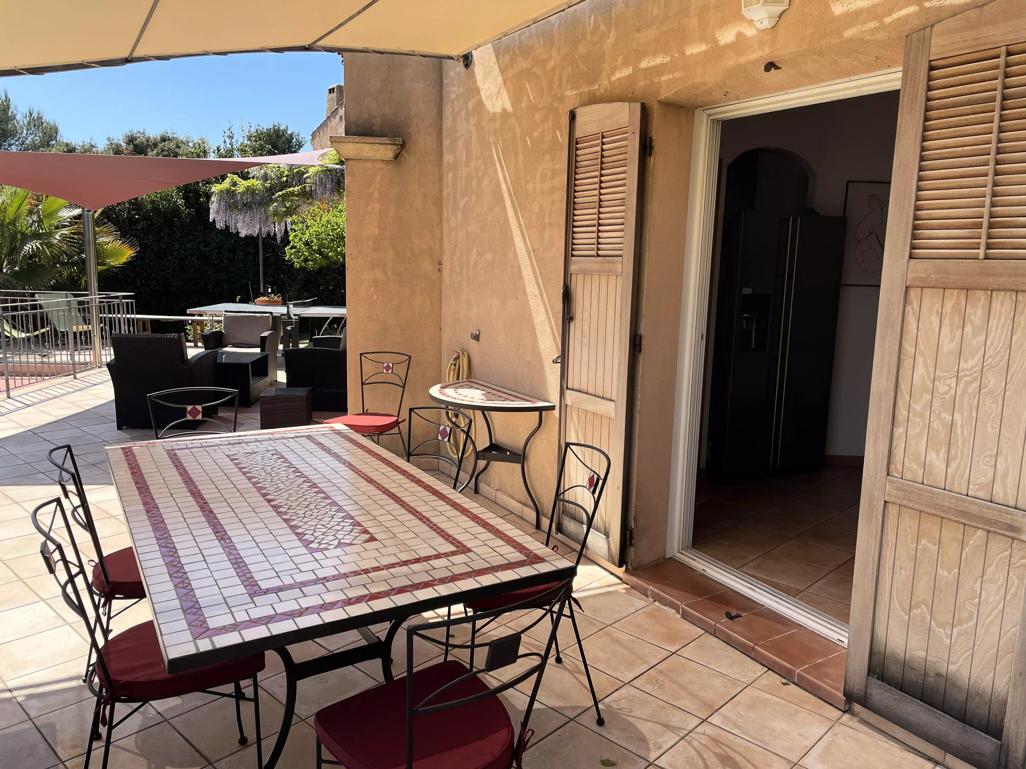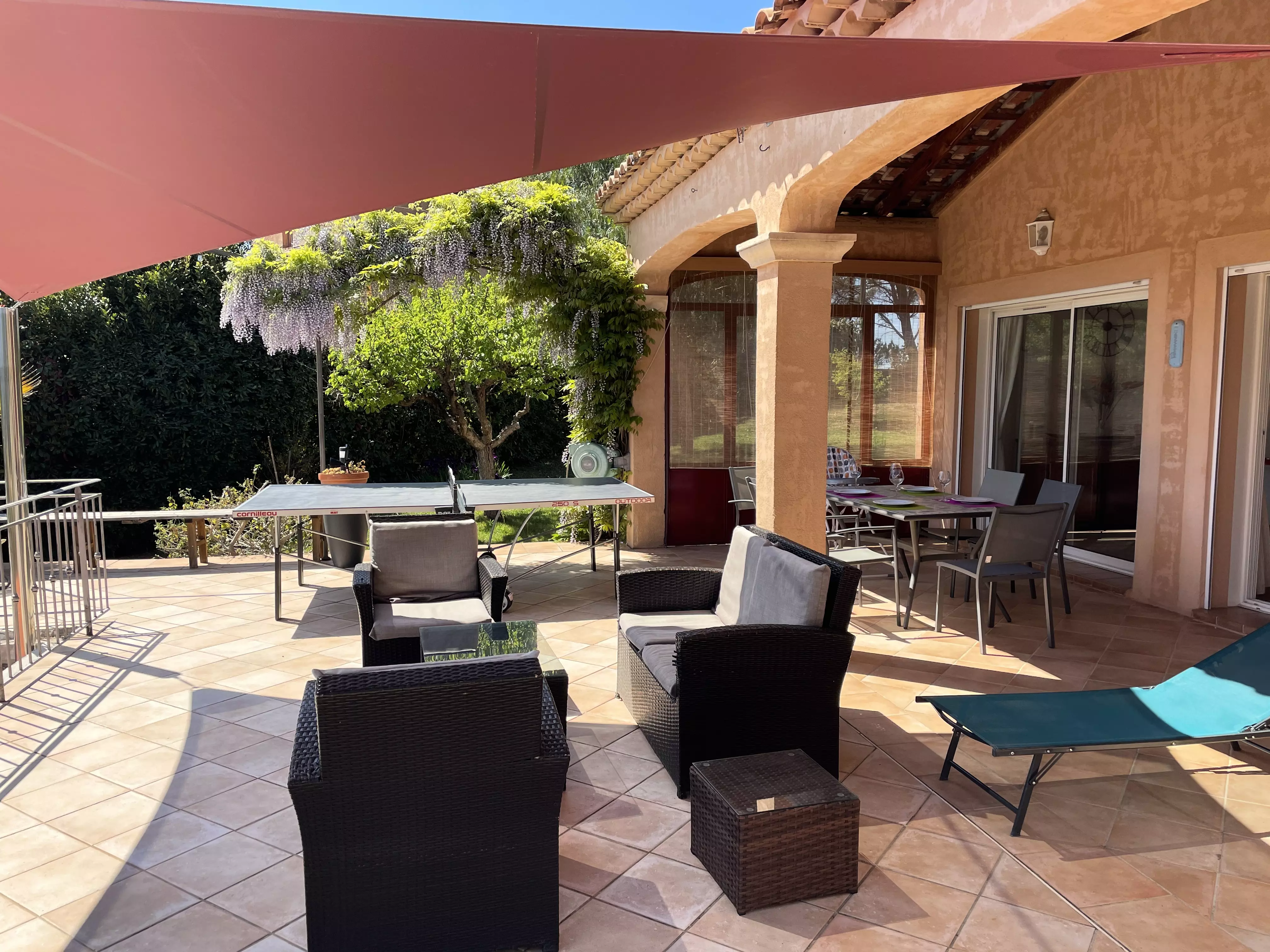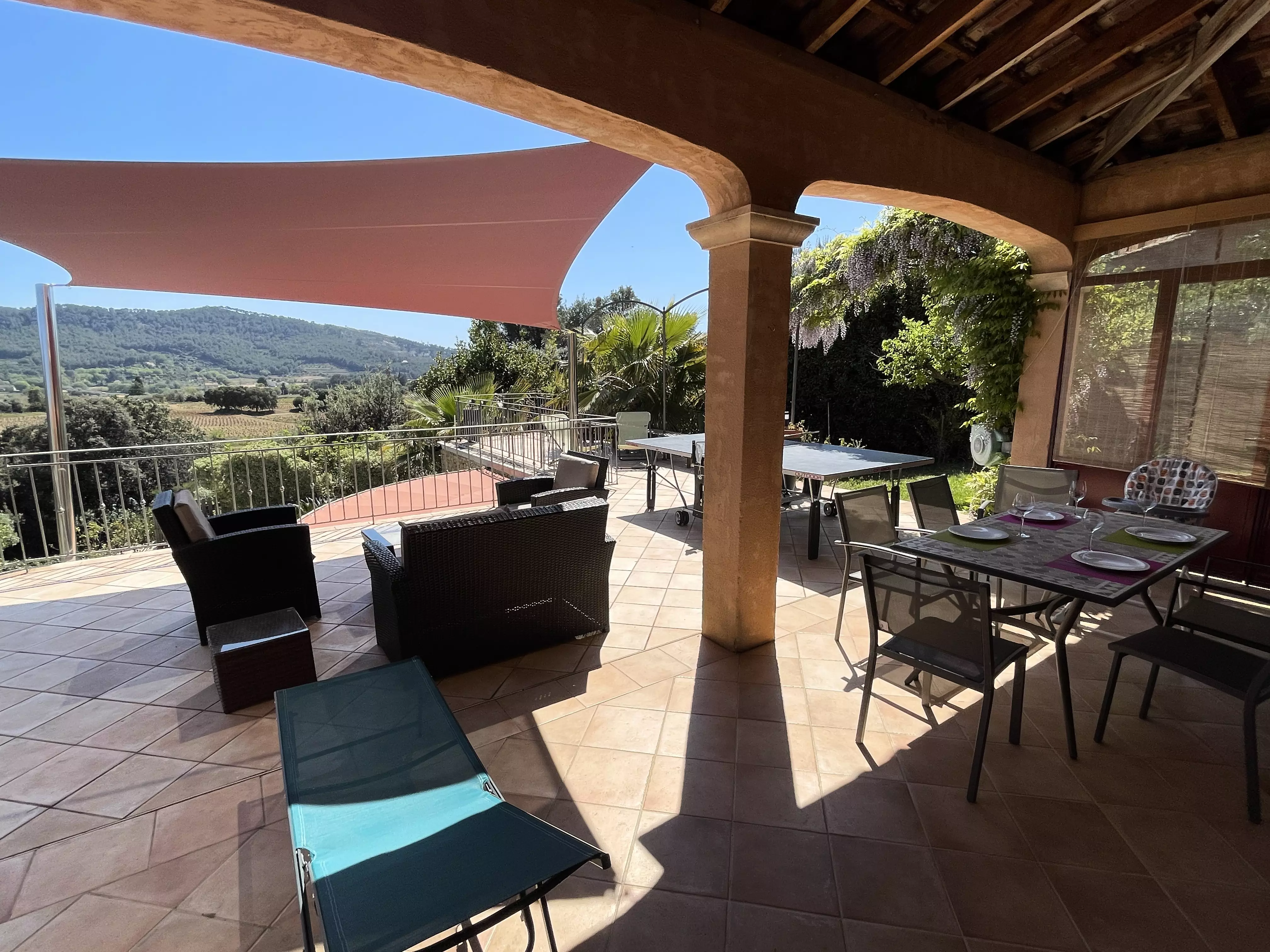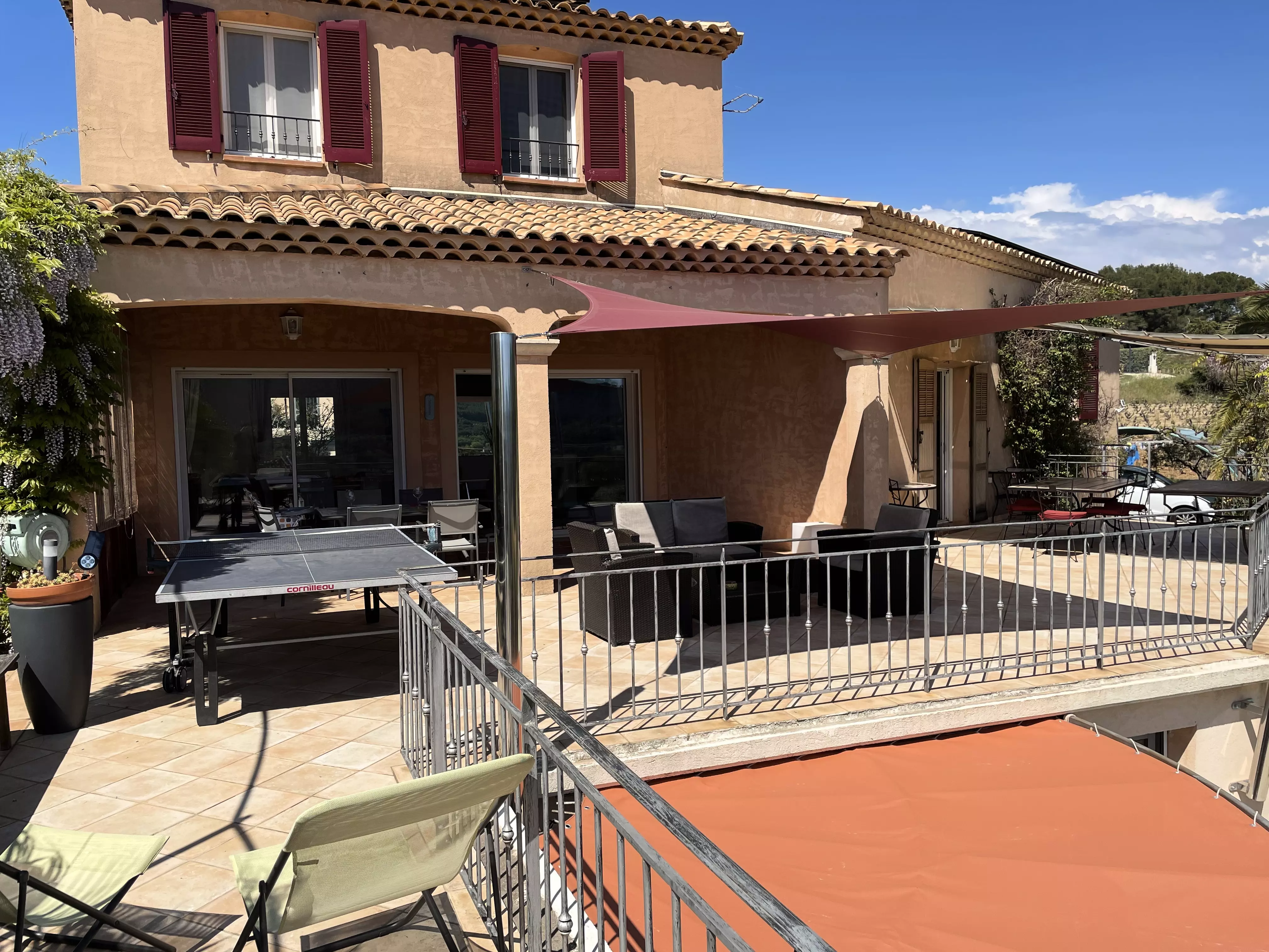 Les atouts de votre location : Cette villa avec vue sur les vignes offre un cadre idéal pour des vacances en famille ou entre amis. Elle dispose d'un rez-de-chaussée avec une chambre, de deux chambres à l'étage et d'un pool house au niveau de la piscine avec deux chambres équipées d'un rafraîchisseur d'air. Profitez d'un sol rafraîchissant dans la maison principale et d'une terrasse couverte orientée sud-est avec vue sur le jardin, barbecue, table extérieure et 10 chaises. Les amateurs de loisirs apprécieront le terrain de pétanque, le baby-foot, la table de tennis de table et la piscine privée. Plusieurs places de stationnement avec zones d'ombre et une borne de recharge pour véhicule électrique complètent ce logement pratique et convivial pour un séjour inoubliable.