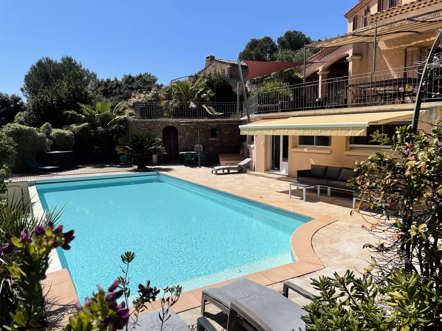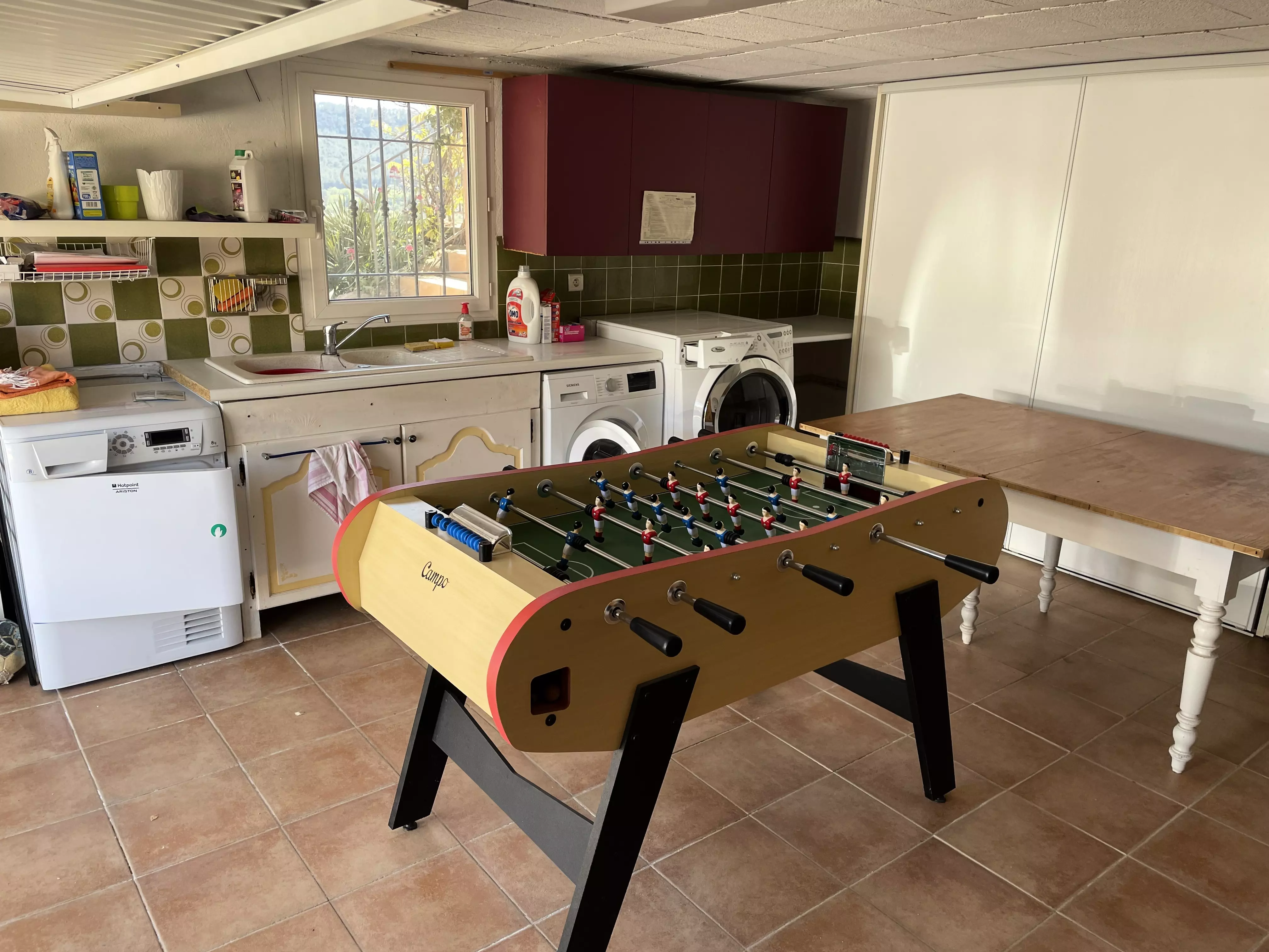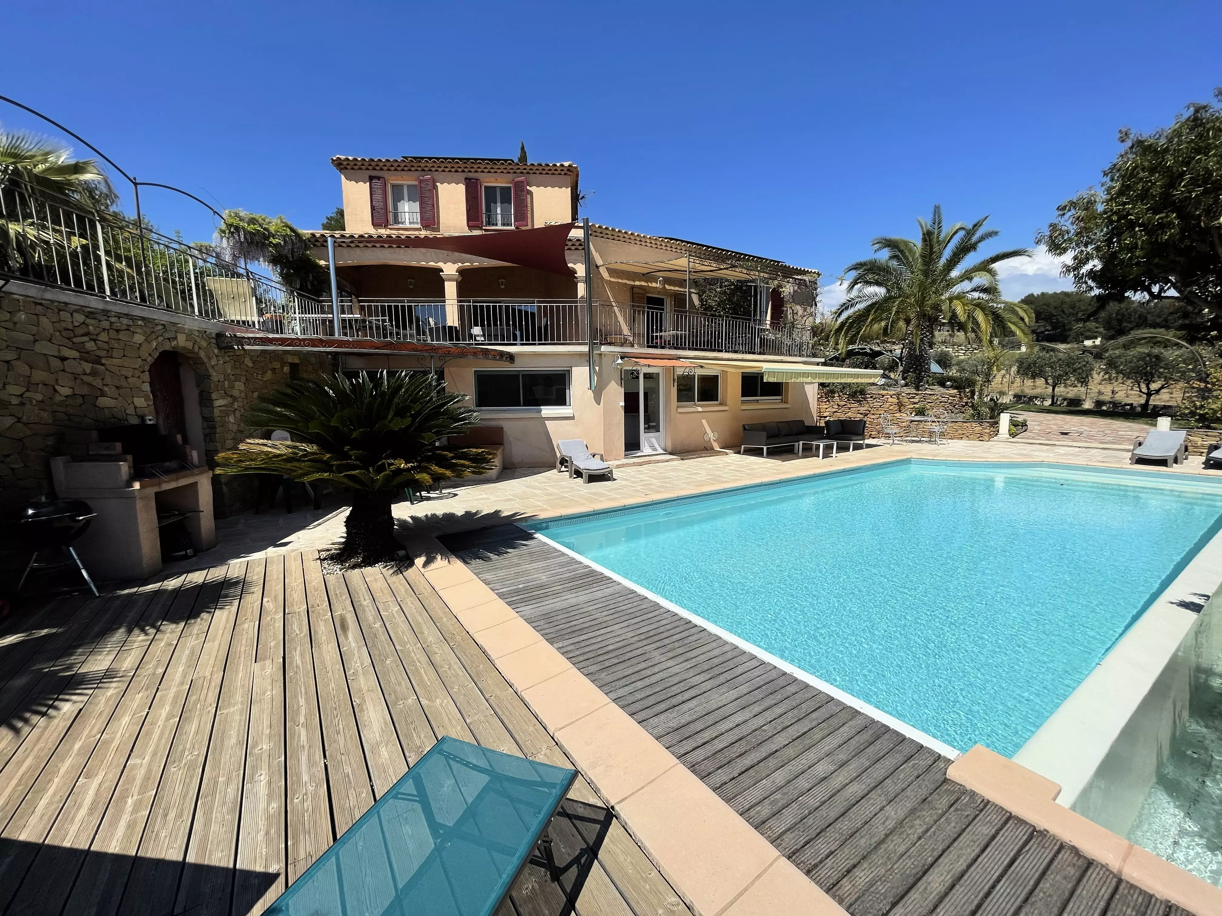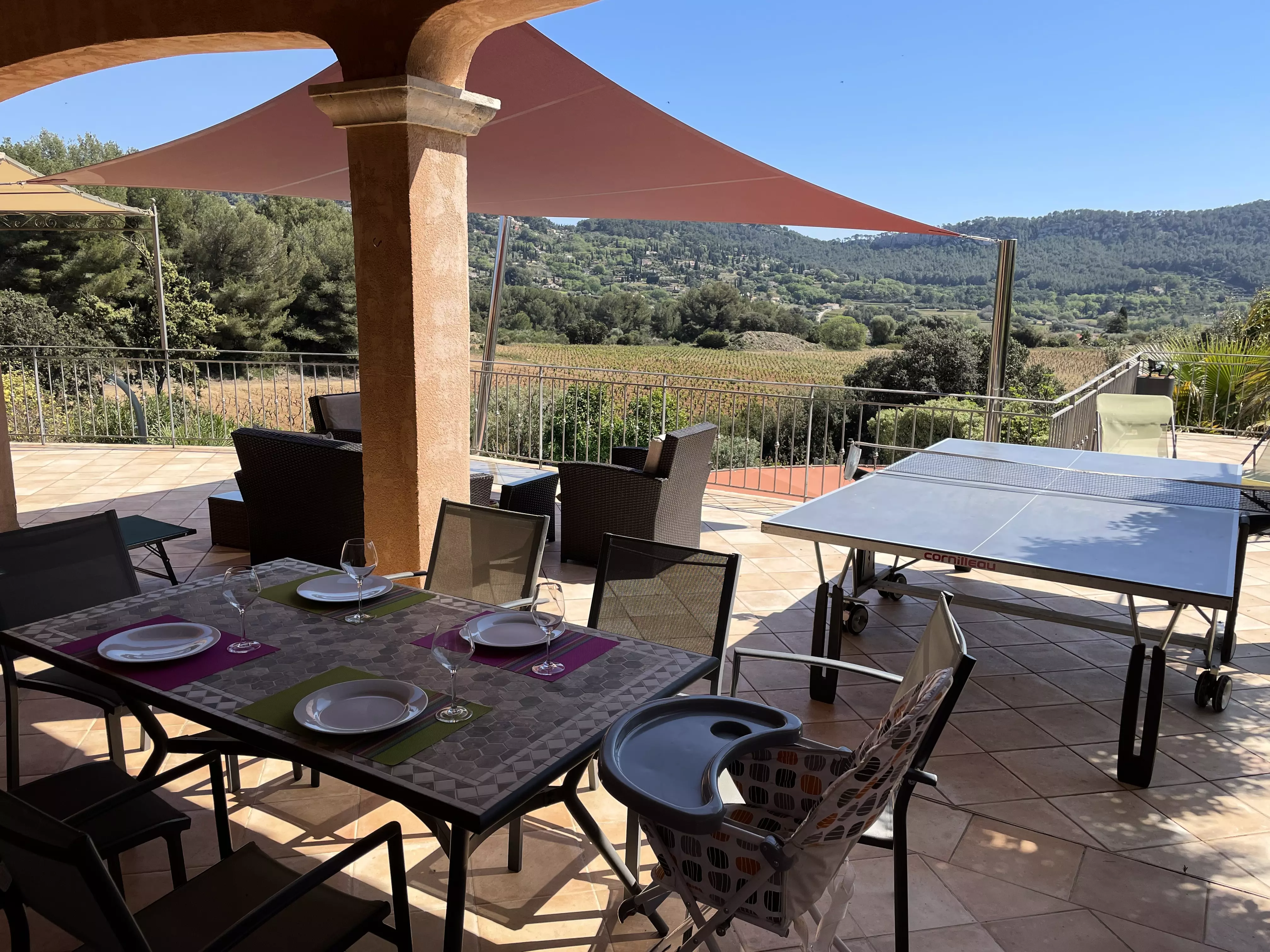 Les atouts de votre location : Cette villa avec vue sur les vignes offre un cadre idéal pour des vacances en famille ou entre amis. Elle dispose d'un rez-de-chaussée avec une chambre, de deux chambres à l'étage et d'un pool house au niveau de la piscine avec deux chambres équipées d'un rafraîchisseur d'air. Profitez d'un sol rafraîchissant dans la maison principale et d'une terrasse couverte orientée sud-est avec vue sur le jardin, barbecue, table extérieure et 10 chaises. Les amateurs de loisirs apprécieront le terrain de pétanque, le baby-foot, la table de tennis de table et la piscine privée. Plusieurs places de stationnement avec zones d'ombre et une borne de recharge pour véhicule électrique complètent ce logement pratique et convivial pour un séjour inoubliable.
