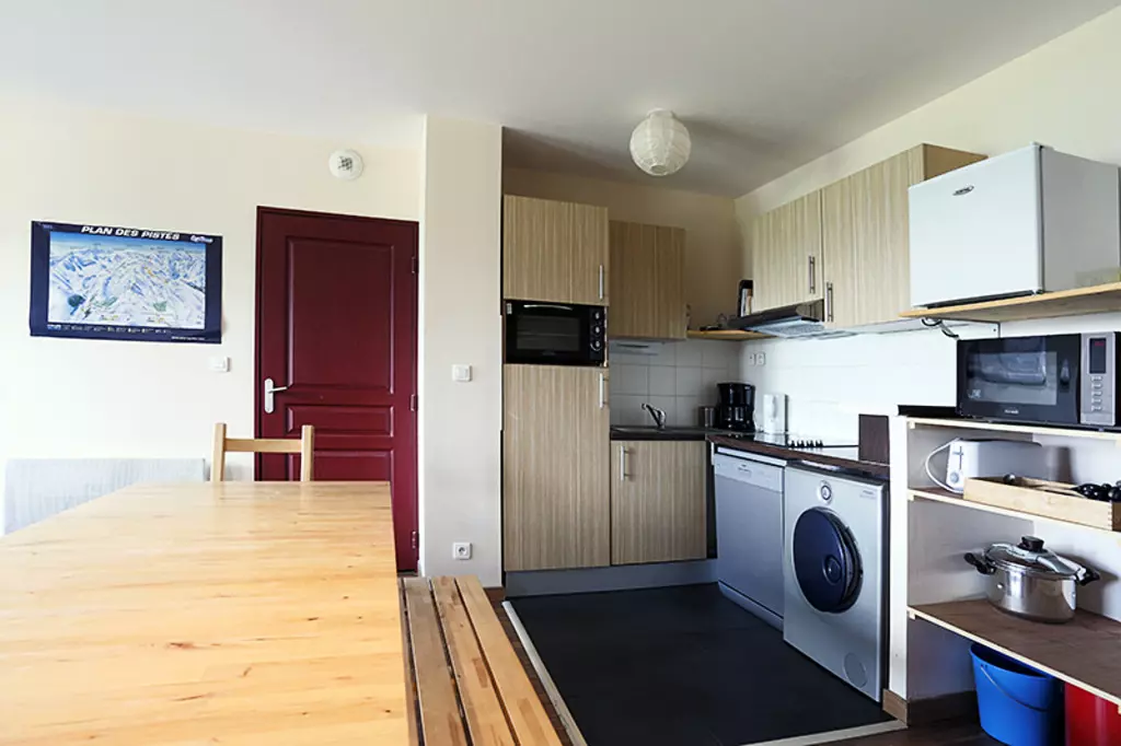 Kitchenette équipée de 4 plaques vitrocéramiques, d'un four, d'un micro ondes, d'un réfrigérateur et d'un lave vaisselle et d'un lave linge..