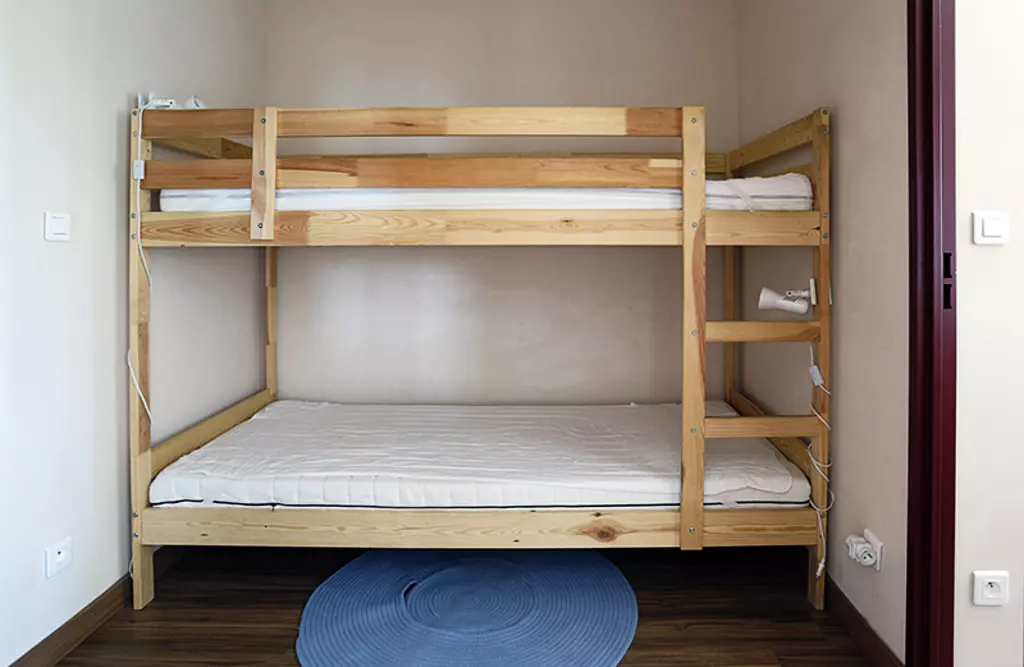 Chambre 1 avec 2 lits en 90 et chambre 2 avec 1 lit superposé en 90 (le couchage en hauteur ne convient pas aux enfants de moins de 6 ans).