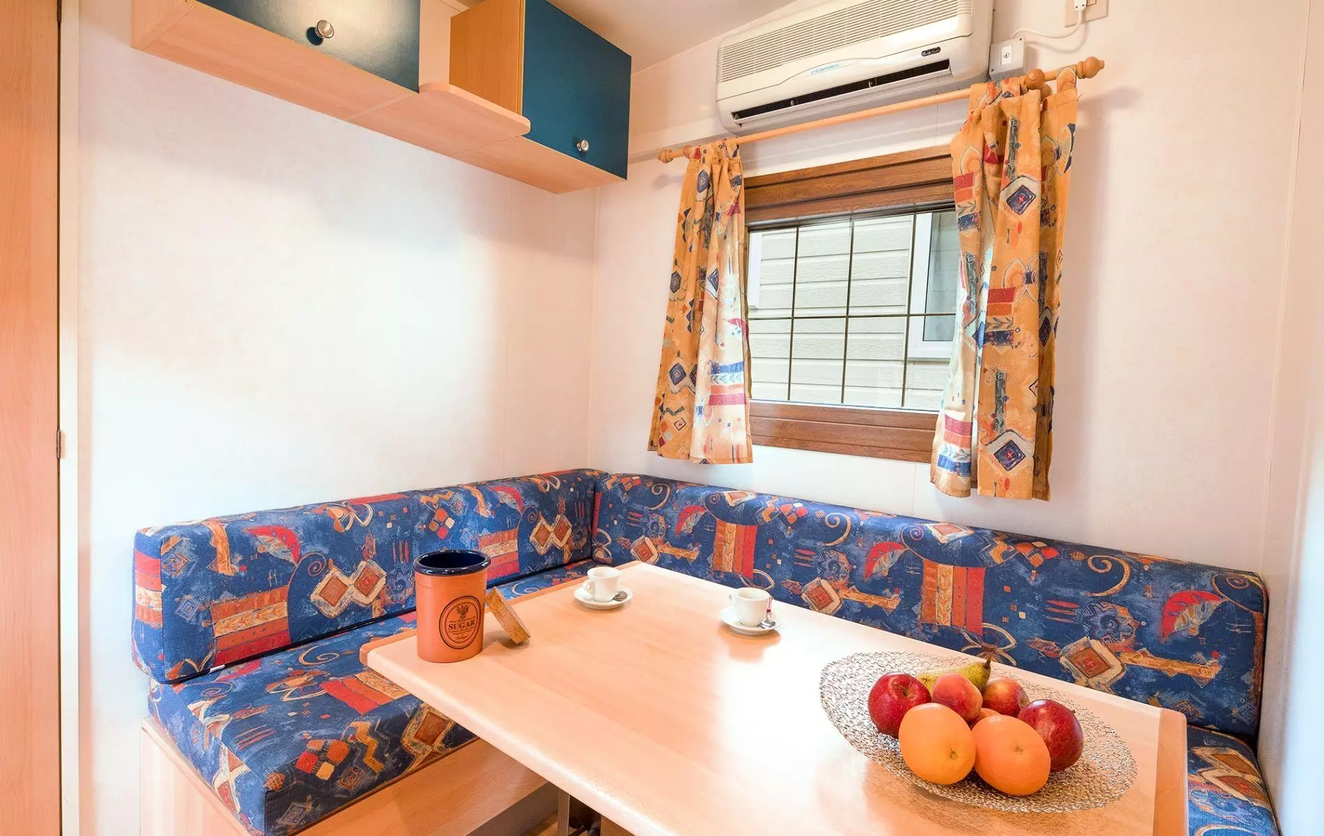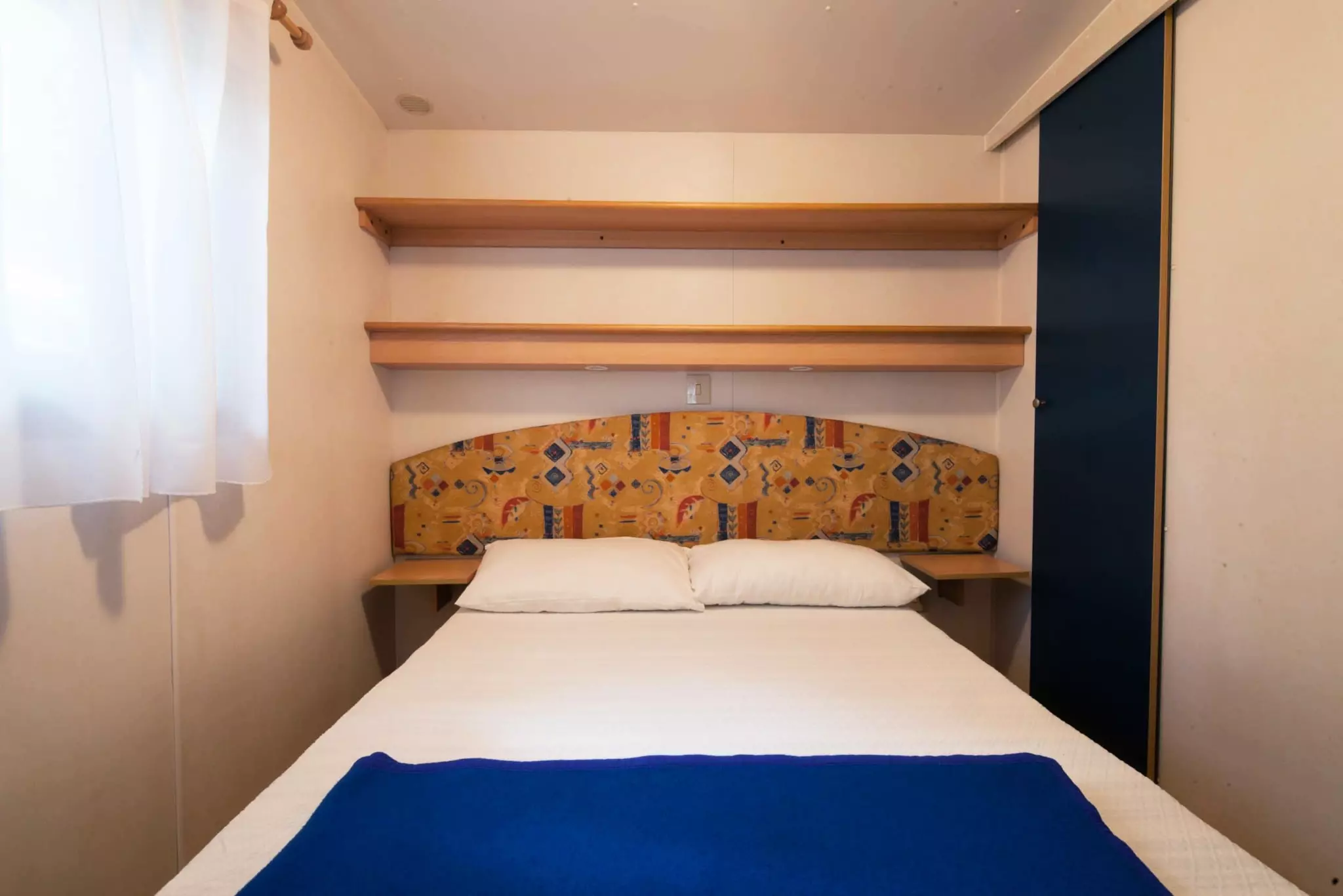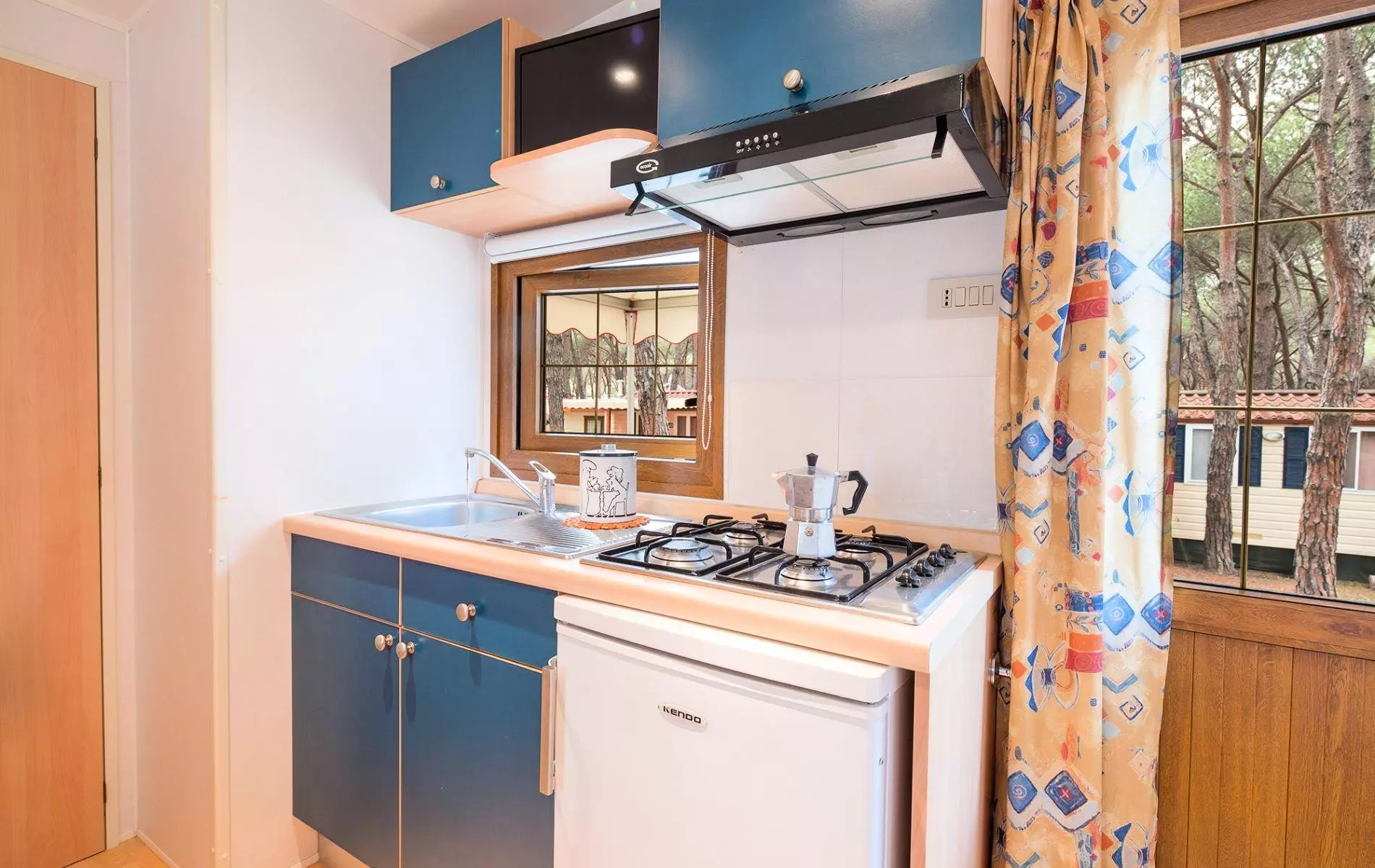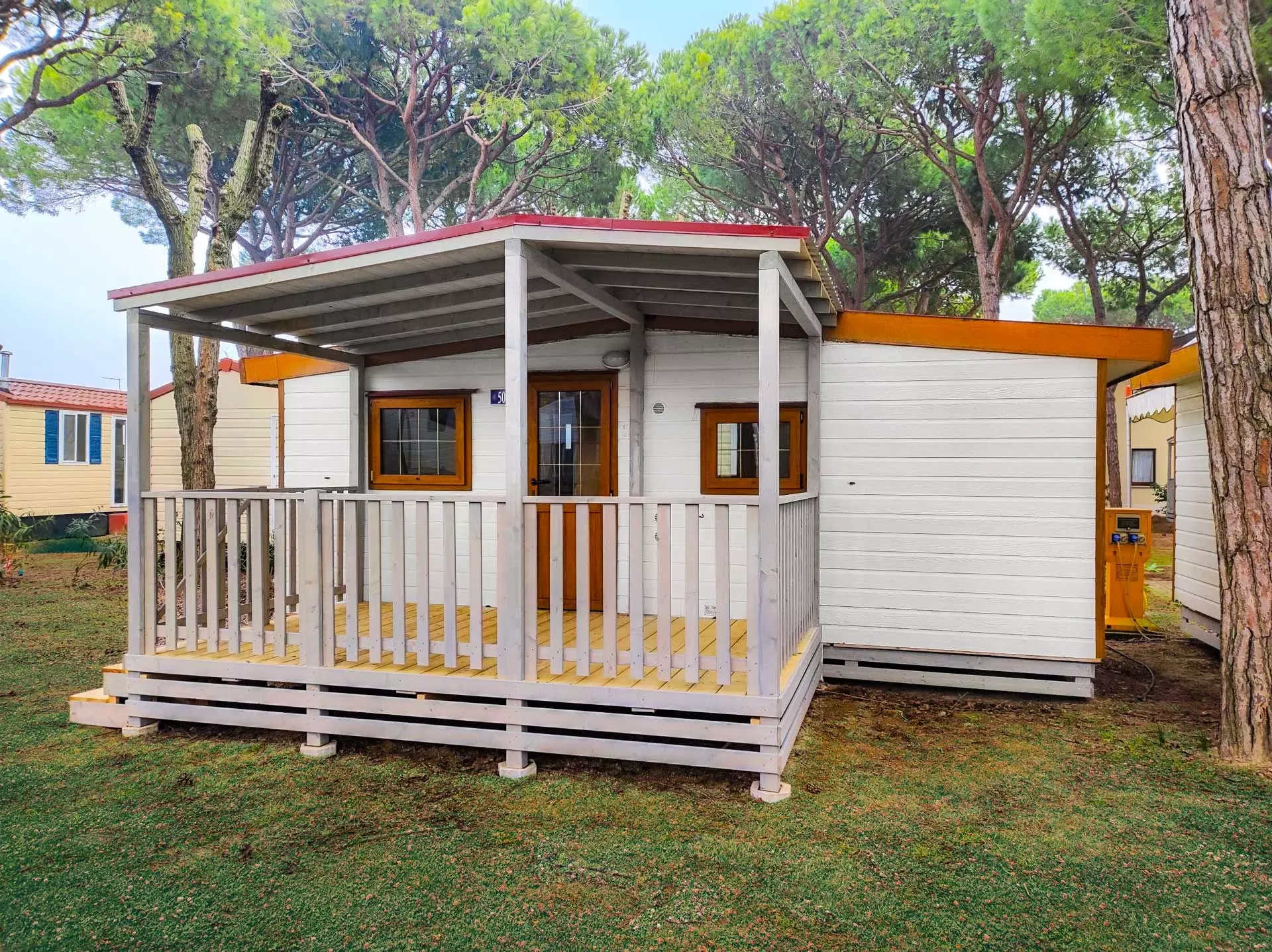 It has an area of about 31 sq.m. and can hold up to maximum of 4 adults and 1 child. This mobile home, with its recently renovated interior, it is composed of a living room with table, chairs and a small sofabed, a kitchenette equipped with a column fridge with freezer, a 4-burner gas cooker, a sink, pots and pans, dishes, American coffee machine and microwave. The sleeping area consists of 2 bedrooms, one with a double bed and a spacious bedroom with 2 single beds, which can be joined together on request. The accommodation has 1 spacious bathroom with WC, shower, bidet and washbasin. Outside a wooden veranda is equipped with a table and chairs where you can enjoy relaxing moments!