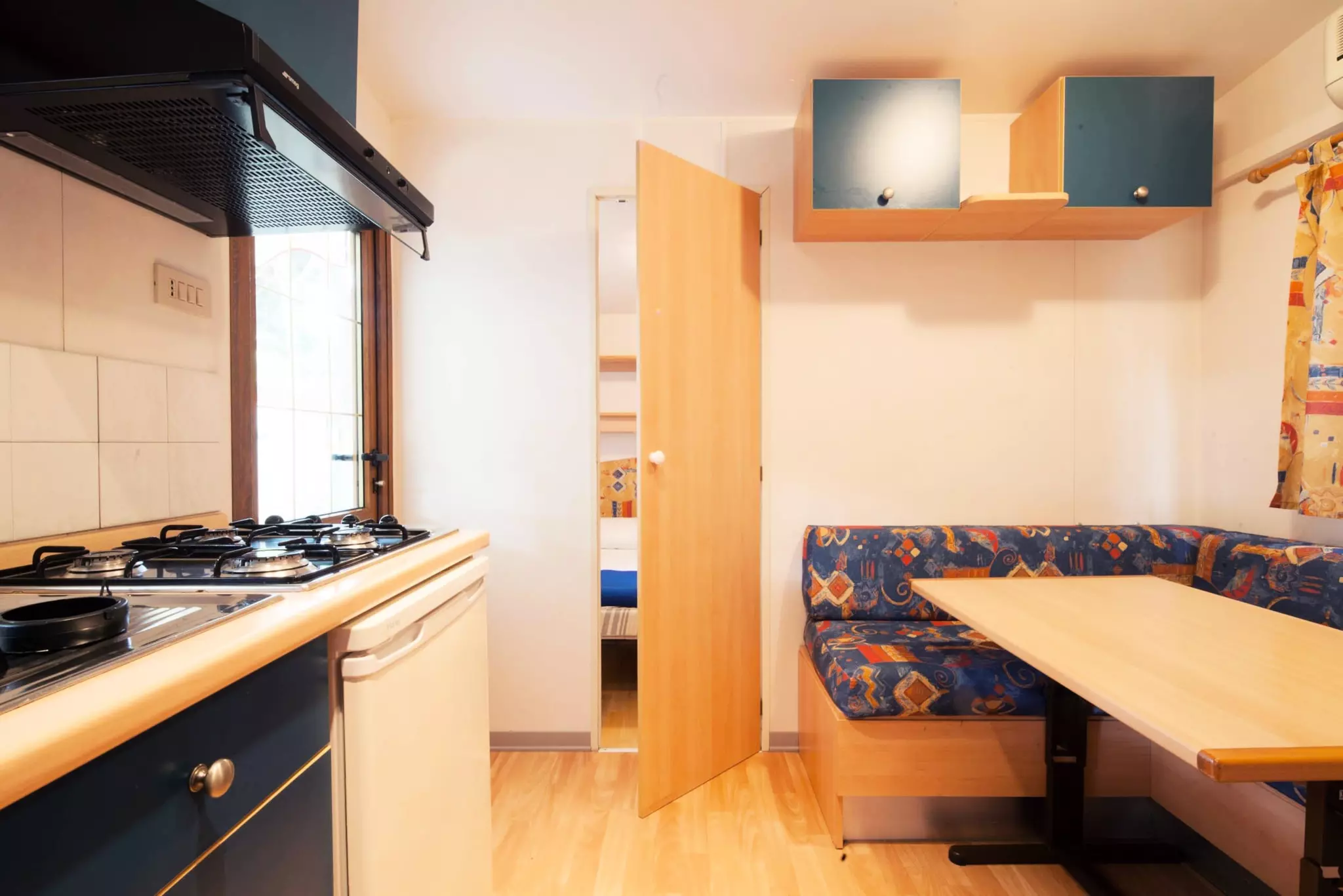 It has an area of about 24 sq.m. and can hold up to 4 adults and 2 children. It is composed of a living room with table, chairs, a sofa bed, a kitchenette equipped with a column fridge with freezer or a fridge with icebox, a 4-burner gas cooker, a sink, pots and pans and dishes. The sleeping area consists of 2 bedrooms, one with a double bed and one with 2 single beds plus a third raised bed. The accommodation has 1 bathroom divided into 2 rooms: 1 shower and sink and 1 toilet and sink. A white gazebo equipped with table and chairs complete the accommodation.