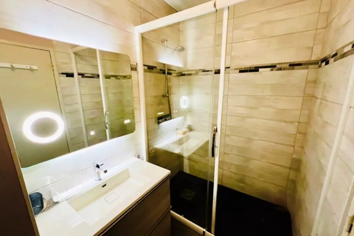 Vous profiterez d’une salle de douche pratique, d’une cuisine entièrement équipée et d’un espace salon accueillant avec un canapé convertible de 140x190.