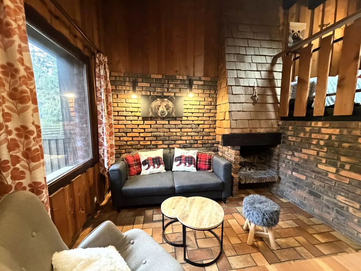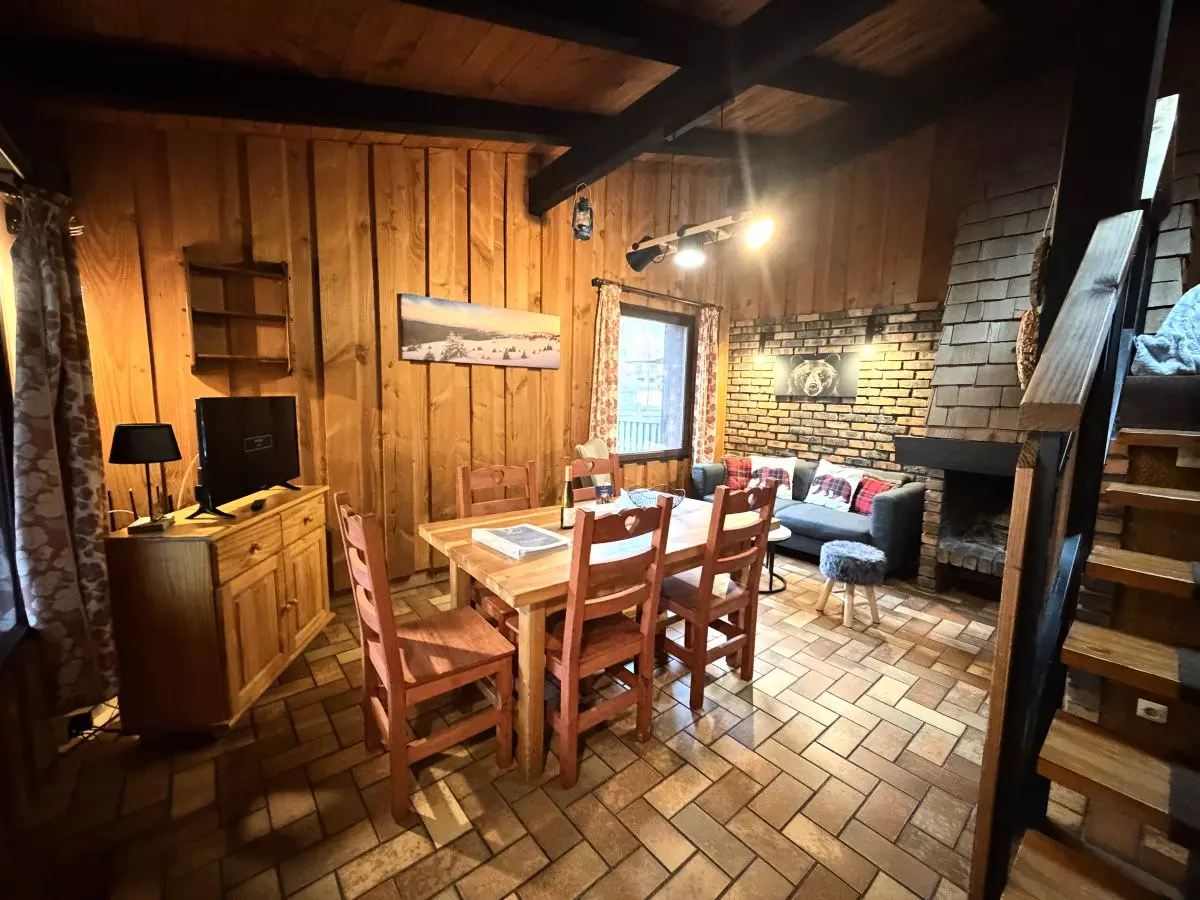 - Salon/Séjour : Espace chaleureux avec canapé confortable, cheminée, télévision à écran plat et coin repas, idéal pour se détendre en famille ou entre amis