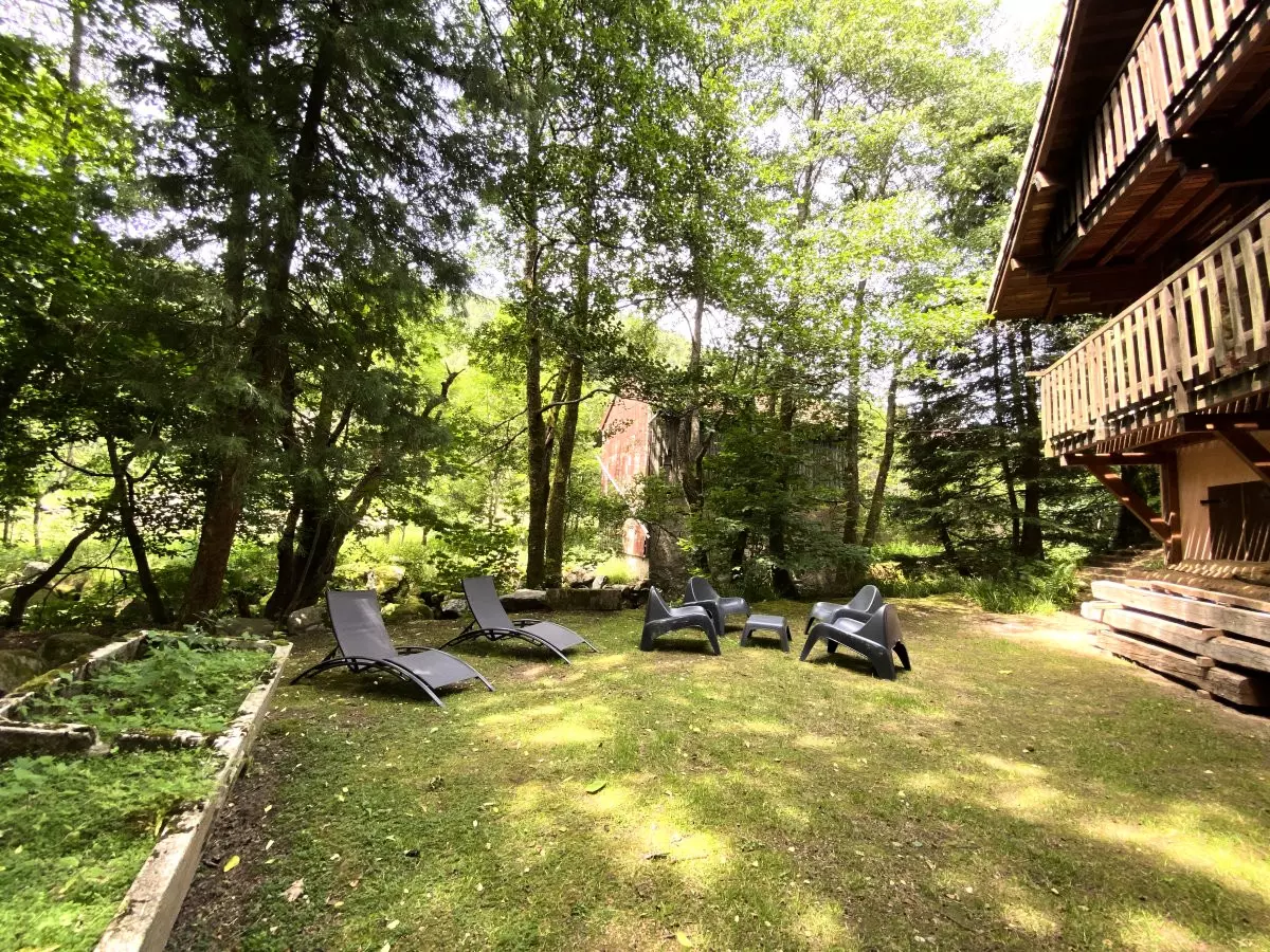 - Jardin avec grand espace vert en bord de rivière, idéal pour les activités en plein air.