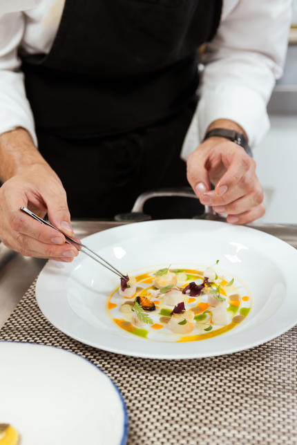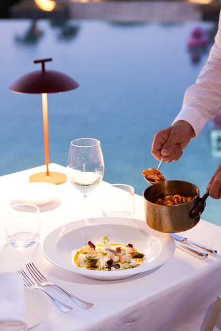 restaurant avec service à table : "La Table by La Villa" cuisine française, cuisine méditerranéenne, show-cooking (pour déjeuner, pour dîner, à la carte, avec terrasse, vue mer, soirée à thème, sur réservation)
