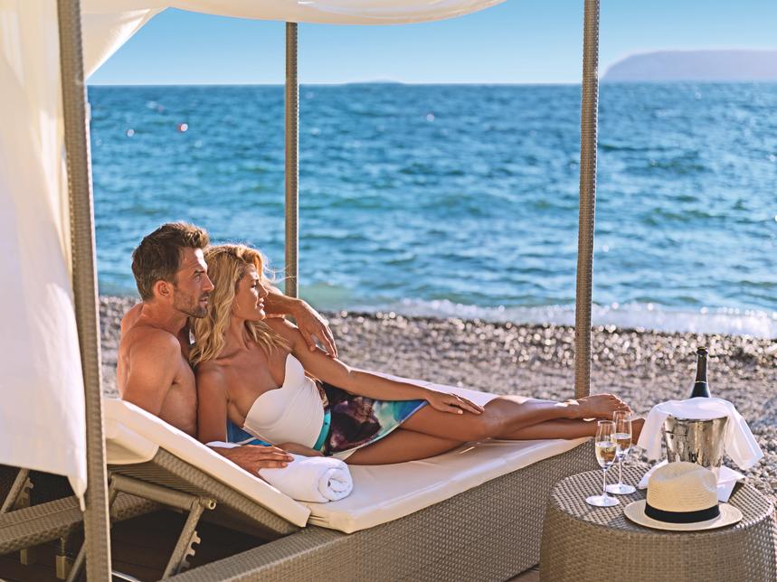 terrasse avec draps de bain, chaises longues, parasols, lits balinais