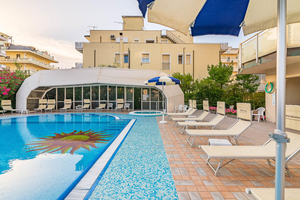 Appréciable pour les vacanciers de tous âges, l’hôtel Universal est un choix idéal pour profiter d’un séjour en famille sur le front de mer de Cervia. Vous y apprécierez la plage dorée attenante, l’atmosphère chaleureuse, les chambres lumineuses et confortables, mais également la piscine et l’espace bien-être avec sa salle de fitness. Pour divertir les plus jeunes, l’hôtel propose également un mini-club et chaque jour, vous pourrez vous délecter de délicieuses spécialités au restaurant panoramique, qui mise sur une préparation minutieuse et l’usage de produits frais et régionaux.