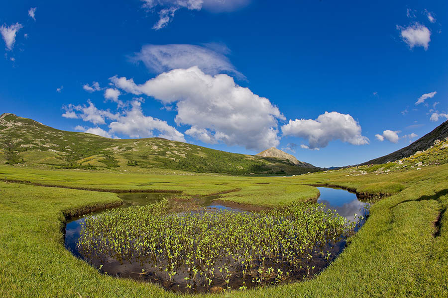Offrez-vous une des plus belles randonnées en Corse pour atteindre des pelouses très vertes morcelées de trous d’eau.