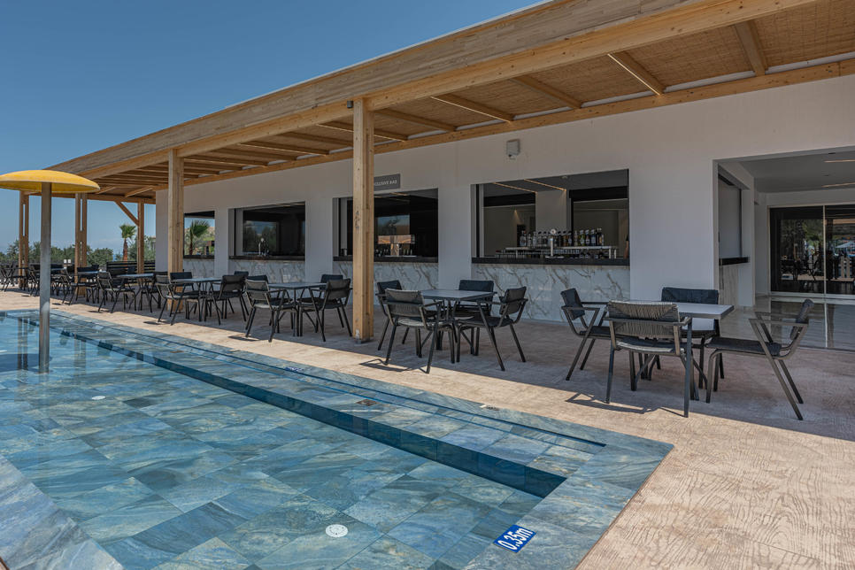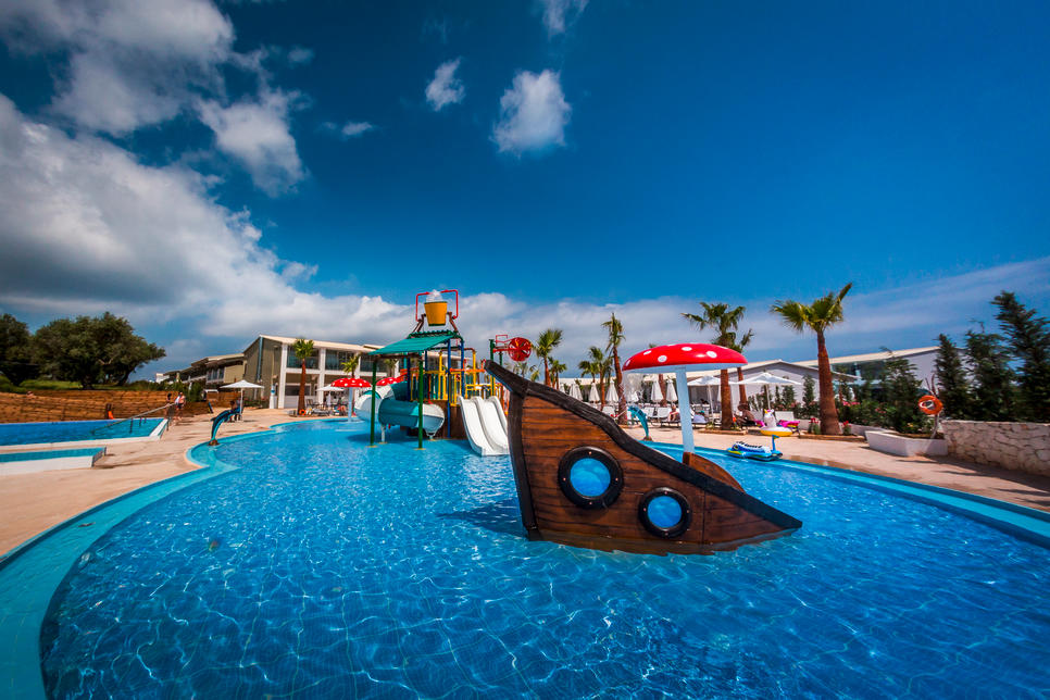 mini-disco, aire de jeux, 1 bassin pour enfants (bateau pirate, avec pentaglisse), 1 bassin à thème (jeux aquatiques), buffet enfants, chaises hautes, lit bébé