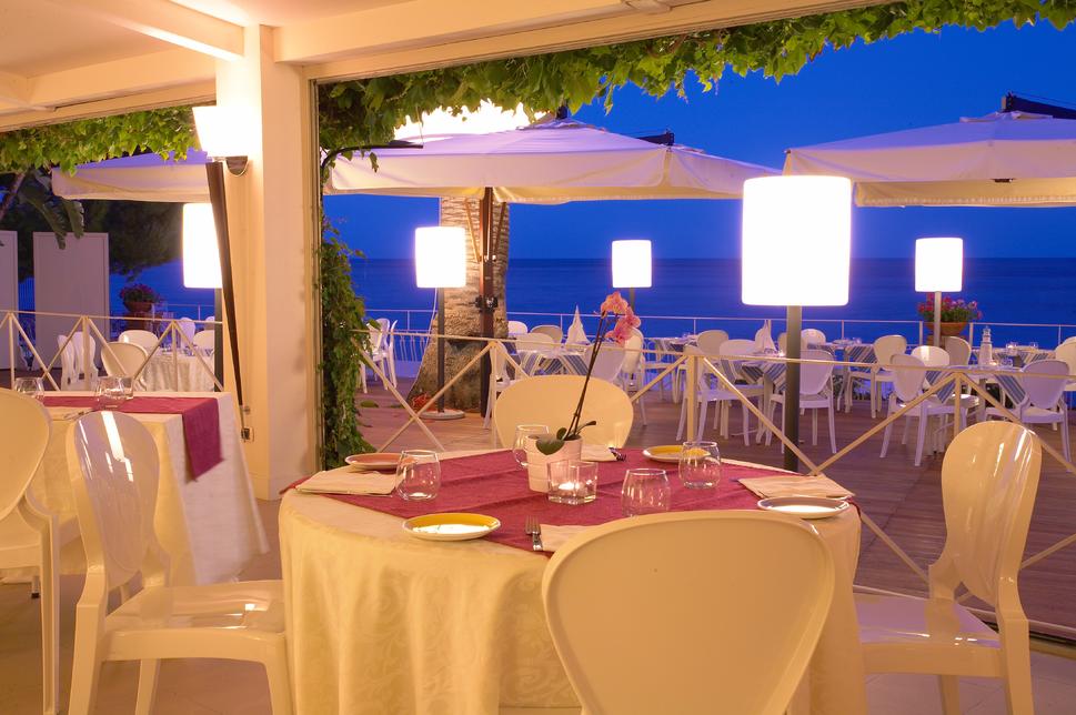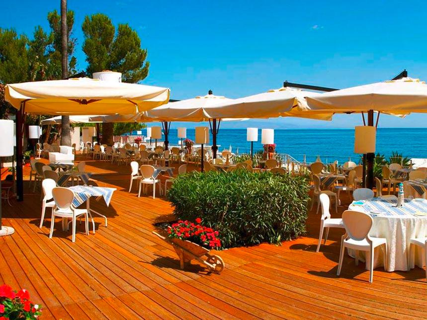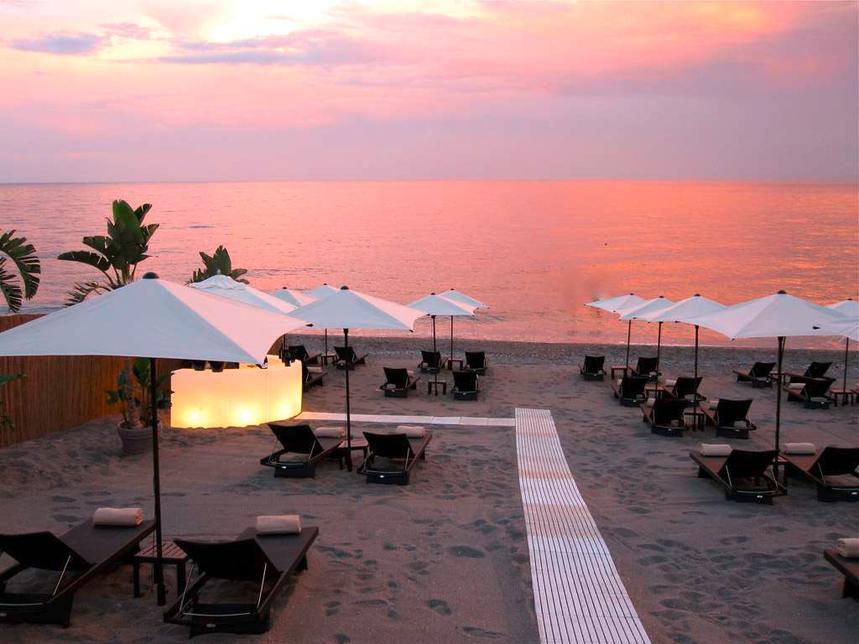 plage privée de galets "Lido Caparena" : séparée par un petit passage souterrain, 2 chaises longues et 1 parasol par chambre à partir de la 2ème rangée (1ère rangée contre supplément) // Service de plage premium réservé aux adultes* : chaises longues plus grandes, lits balinais privés*, draps de bain, bar avec service de boissons* (serveur dédié, sur réservation et réglèment auprès de la réception) // Jardin botanique avec des espèces de plantes rares et tropicales